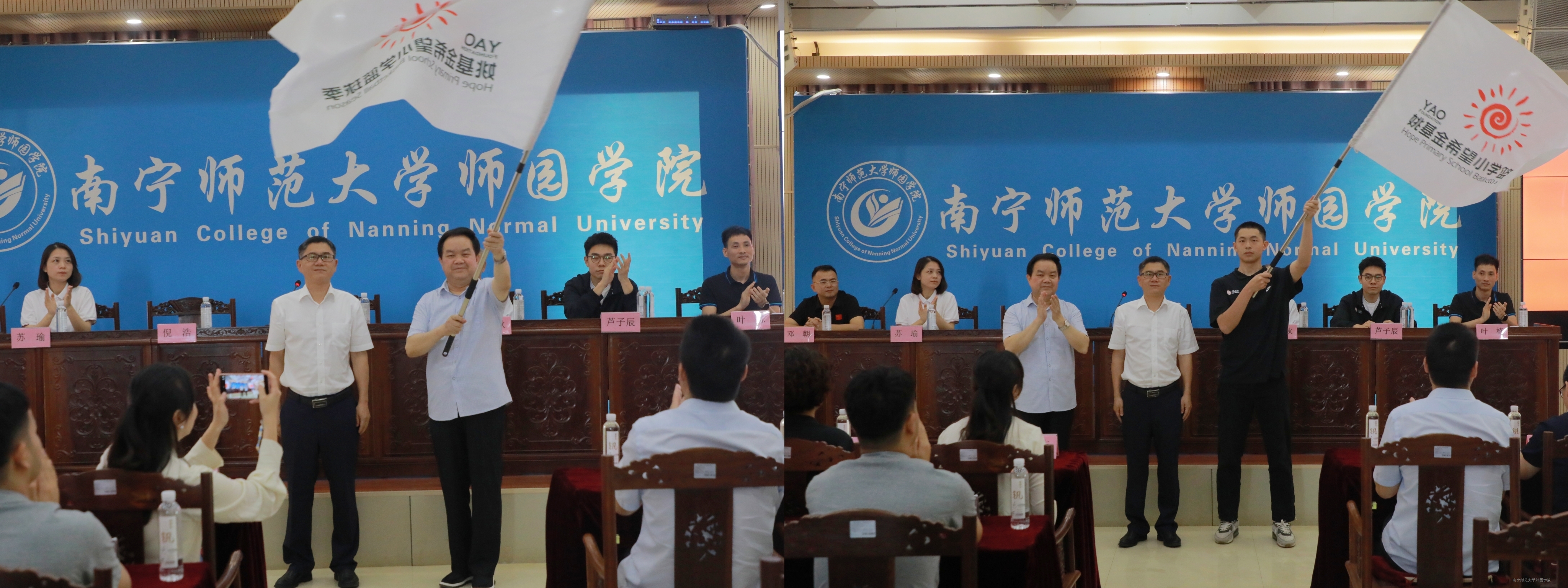 出征仪式上,北京姚明公益基金会项目官员芦子辰为我院志愿者代表颁发“优秀志愿者”奖项,中国人寿南宁分公司党委委员、副总经理倪浩将象征奉献与服务的志愿者旗帜授予我院,李剑喜常务副院长接过旗帜后郑重地交到志愿者代表手中。随后,全体志愿者庄严宣誓,句句铿锵有力,立志尽己所能,为建设团结互助、平等友善、共同前进的美好社会贡献力量。