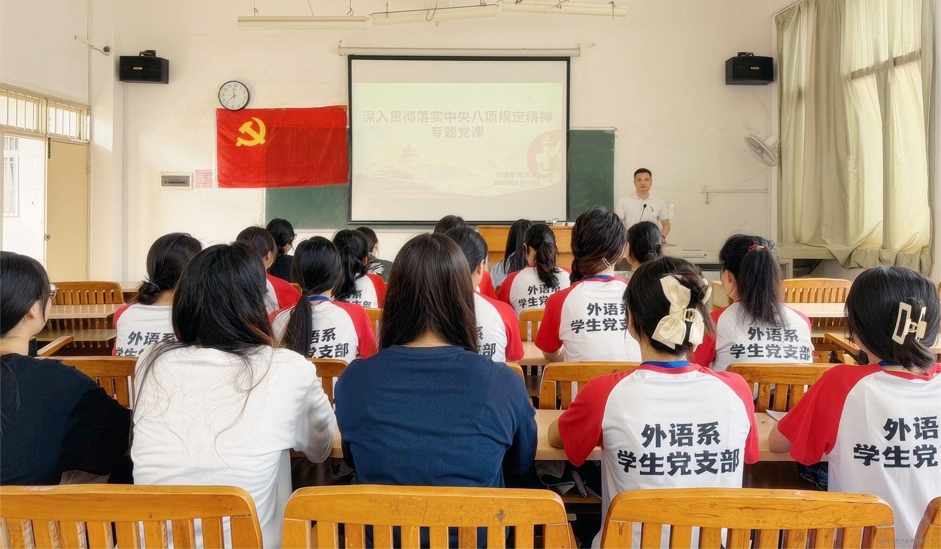 为持之以恒推进作风建设,强化全体党员纪律意识与责任担当,5月14日,外语系党总支在教学楼3-407教室开展深入贯彻中央八项规定精神学习教育专题党课。本次党课由外语系党总支书记苏道佳主讲,外语系全体党员师生参加学习。