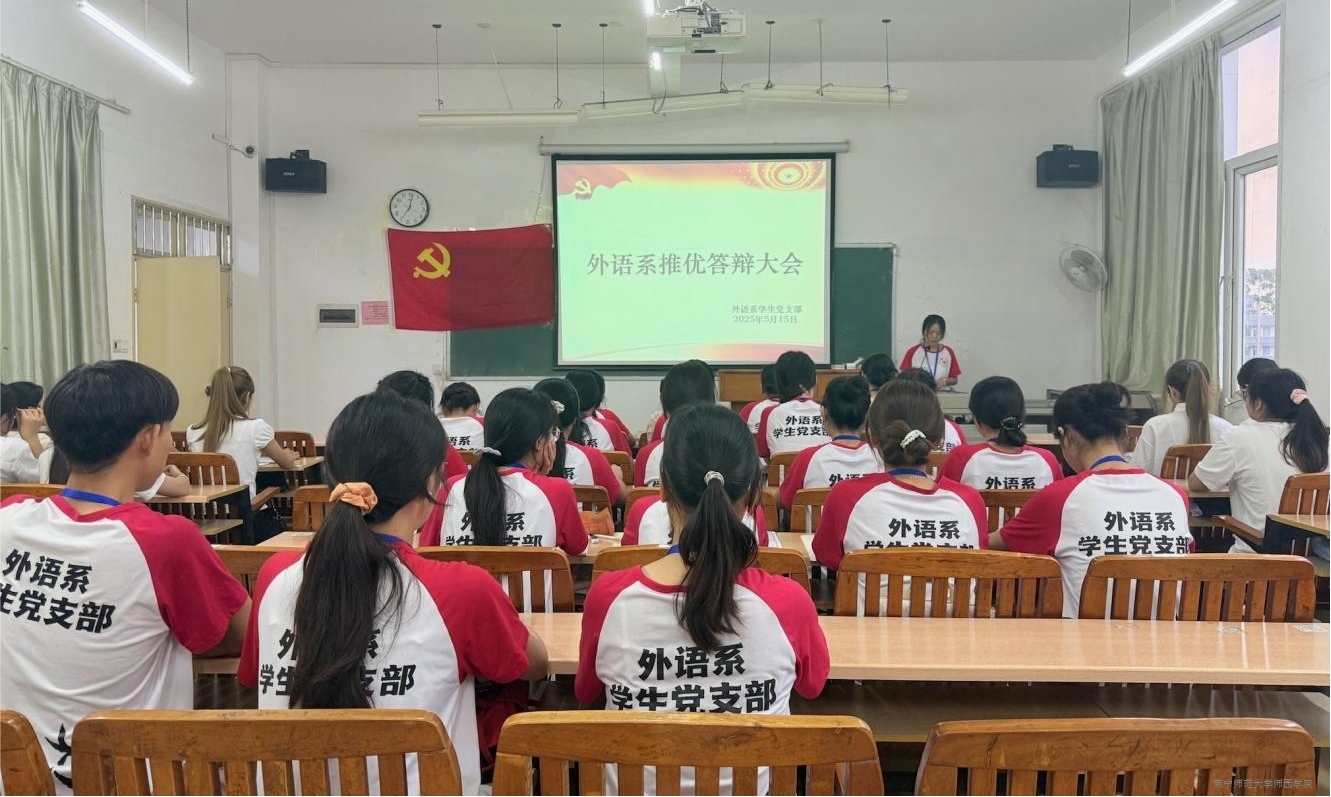 为严格落实党员发展工作规范,切实提升党员队伍整体素质,5月15日,外语系学生党支部在教学楼3-407教室召开2025年春季学期推优入党答辩大会。外语系学生党支部书记傅楠与全体学生党员、25名候选人一起参加会议。