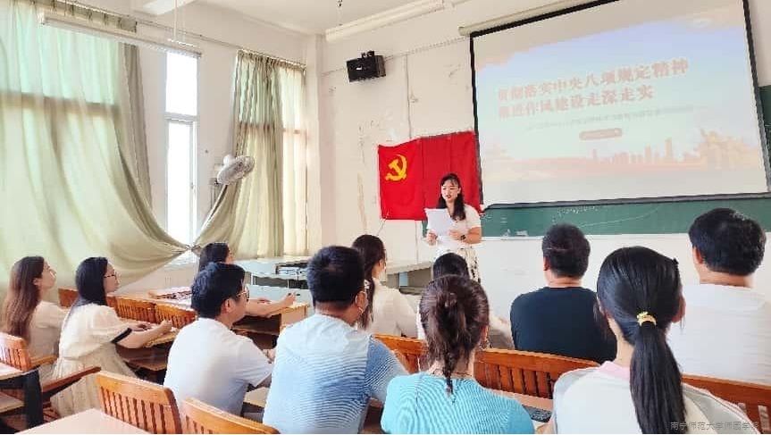随后,党员教师交流学习心得。唐夏春同志表示,人民教师肩负为党和国家培养社会主义现代化建设者和接班人的使命,必须牢记并遵守中央八项规定,以身作则、率先垂范,为学生树立榜样。梁鹏同志认为,学习中央八项规定精神直接关系立德树人根本任务的成效,课堂教学中必须坚持求真务实,以严谨治学态度培育学生。其他党员教师也一致表示,要将中央八项规定精神内化为严谨的治学态度和朴素的生活作风,融入每一次教学中,切实践行“立德树人”要求。