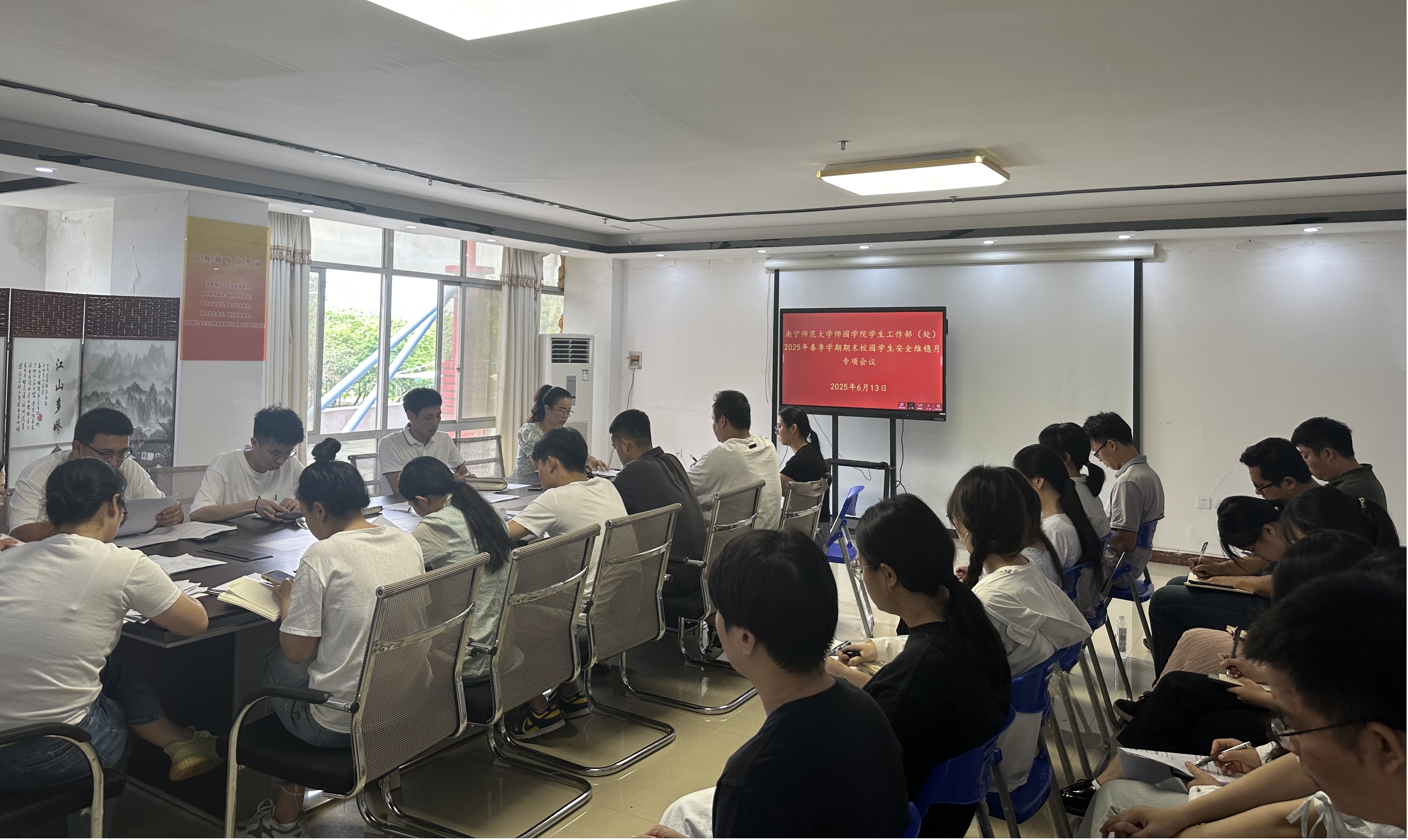 会上,叶栋处长就2025年春季学期期末学生安全稳定工作进行布置,强调三点工作意见,明确工作重点与工作要求。一是要提升政治觉悟,强化责任担当。要深刻领悟维护校园安全及学生安全的重要意义,牢固树立稳定安全的责任观念,将安全工作切实做到位,抓得扎实、细致、有效。二是要明确工作目标,细化落实举措。密切留意学期末学生的思想动态,切实做好学期末对重点关注人群心理状态和思想动态的关注工作,加强对毕业生返校的管理,做好毕业生就业引导与帮扶工作,确保各项工作落到实处、取得实效。三是要严格监督检查,严肃追责问效。在期末阶段,要加大对在校学生的安全教育与安全管理力度,做好学生宿舍的安全隐患排查以及晚归学生的教育工作,加强对学生的思想引领、校风教育和诚信教育,多到学生宿舍走动,耐心细致地做好各项学生管理工作,以维护校园的安全稳定。