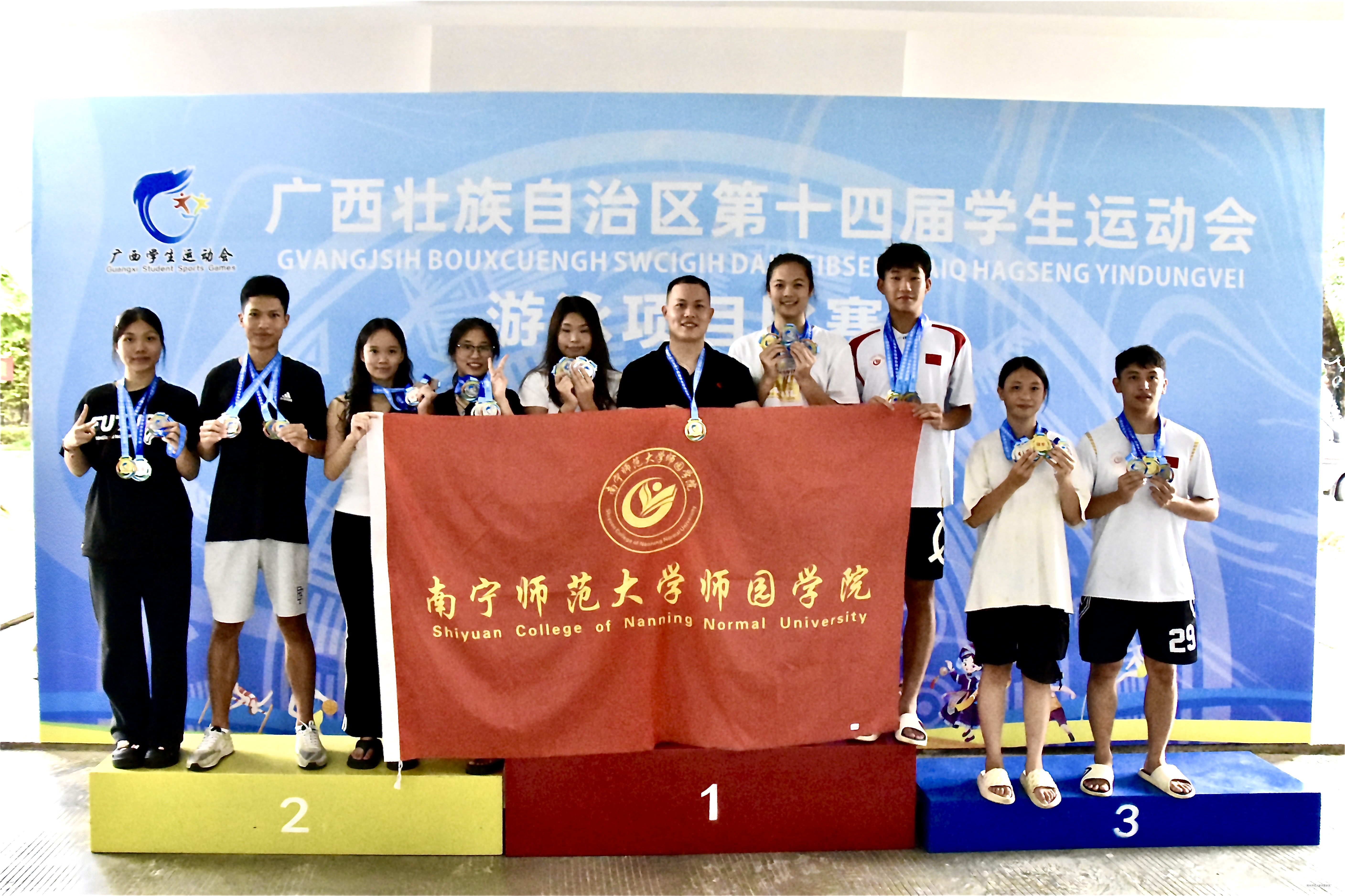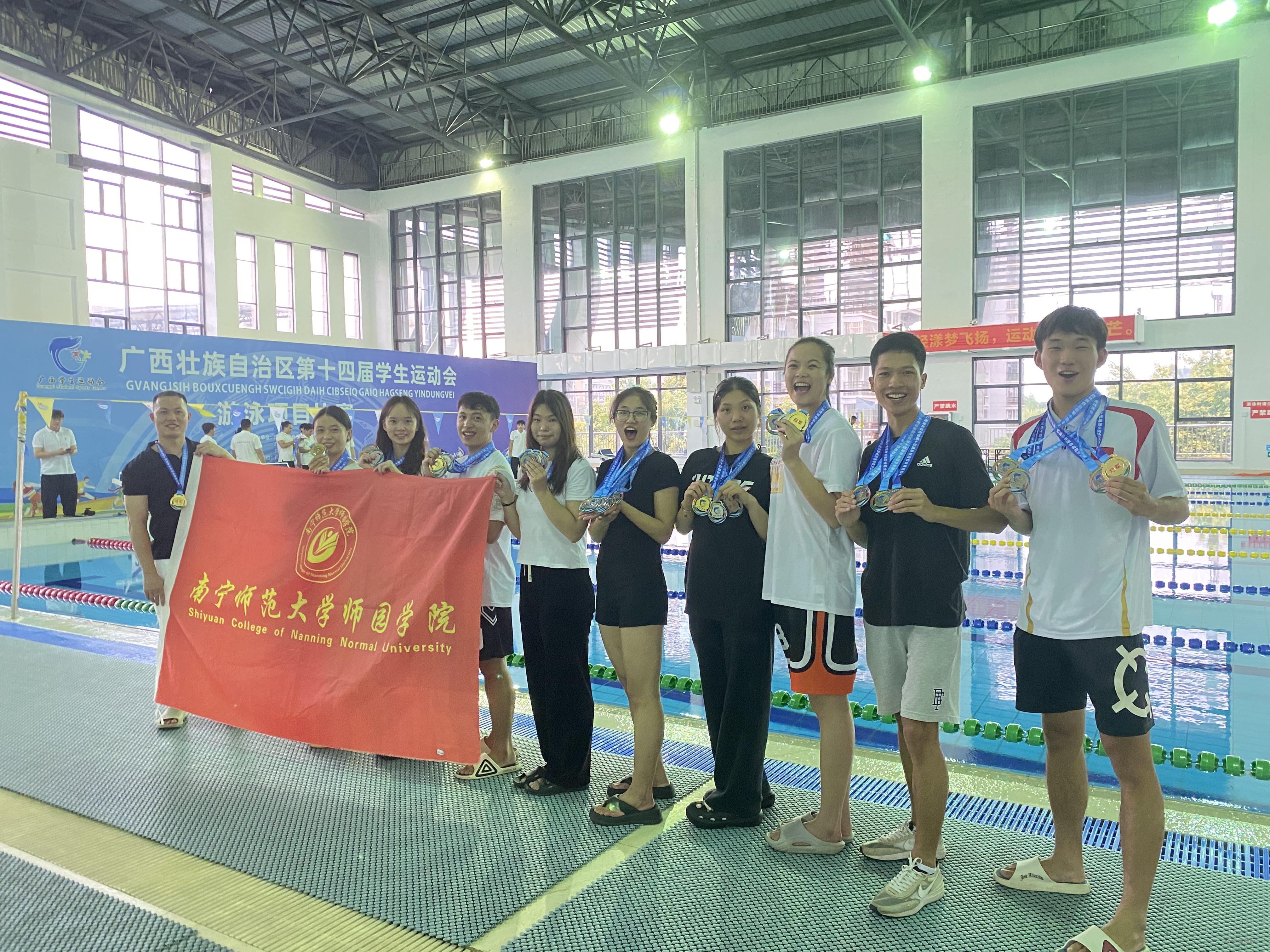7月14日至16日,广西第十四届学生运动会游泳项目比赛在广西中医药大学仙葫校区游泳馆展开了为期三天的激烈角逐。我院大学生游泳队凭借顽强拼搏的精神和出色的竞技水平,在体育专业甲组中表现卓越,最终斩获4枚金牌、8枚银牌、7枚铜牌的优异成绩,为学院赢得了崇高荣誉。