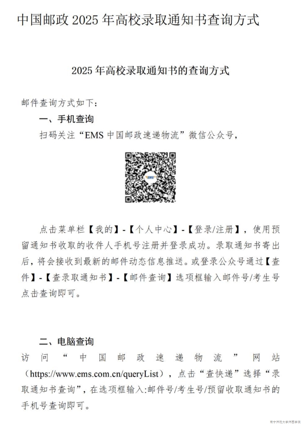 我校在7月31日已通过中国邮政EMS特快专递寄出2025年新生的录取通知书,录取通知书很快将送至各位2025级新同学手中。在学校寄出的每一份信封中都包含有录取通知书、新生入学手册、高校学生资助政策、家庭经济困难学生认定申请表、大学新生应征入伍宣传单页等材料。各位新生可以在EMS中国邮政速递官方网站、EMS中国邮政速递微信公众号等中国邮政速递的高考邮件和录取通知书邮寄信息查询页面使用个人的准考证号、考生号、收件人手机号码等信息查询个人的录取通知书寄递和配送进程。为方便各位新生查询录取通知书邮寄情况,已被录取的新生也可以通过拨打学校招生咨询热线电话咨询了解。