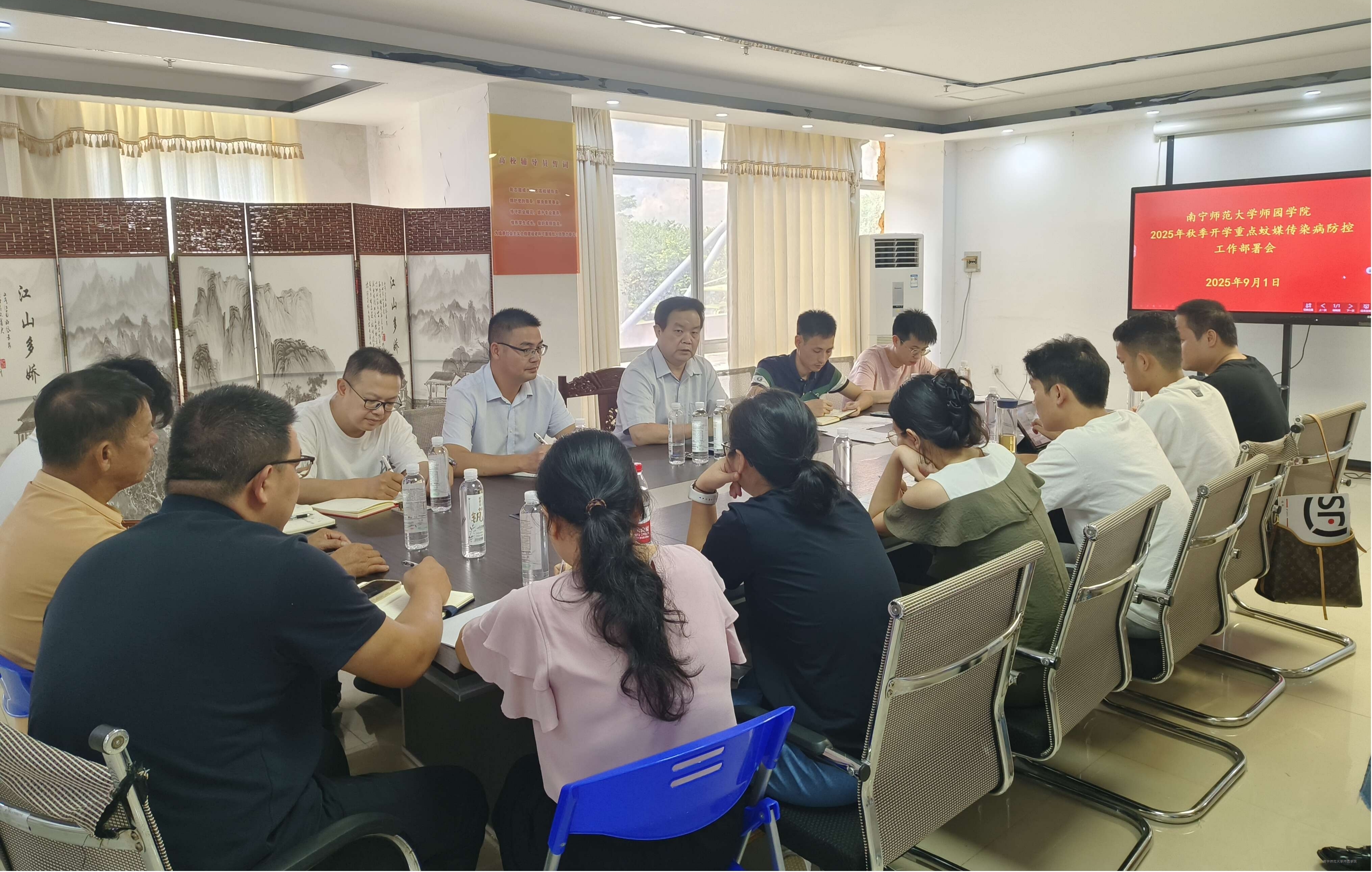 为进一步做好全区教育系统重点蚊媒传染病防控工作,切实预防登革热、基孔肯雅热等蚊媒传染病,保障我校师生健康安全,9月1日上午我校在行政综合楼2楼202会议室召开2025年秋季开学重点蚊媒传染病防控工作部署会。学院党委副书记、常务副校长李剑喜出席会议并作工作部署。党政办公室、学生工作处、后勤处、保卫处、人事处、物业负责人以及各系学工组长参加此次会议。