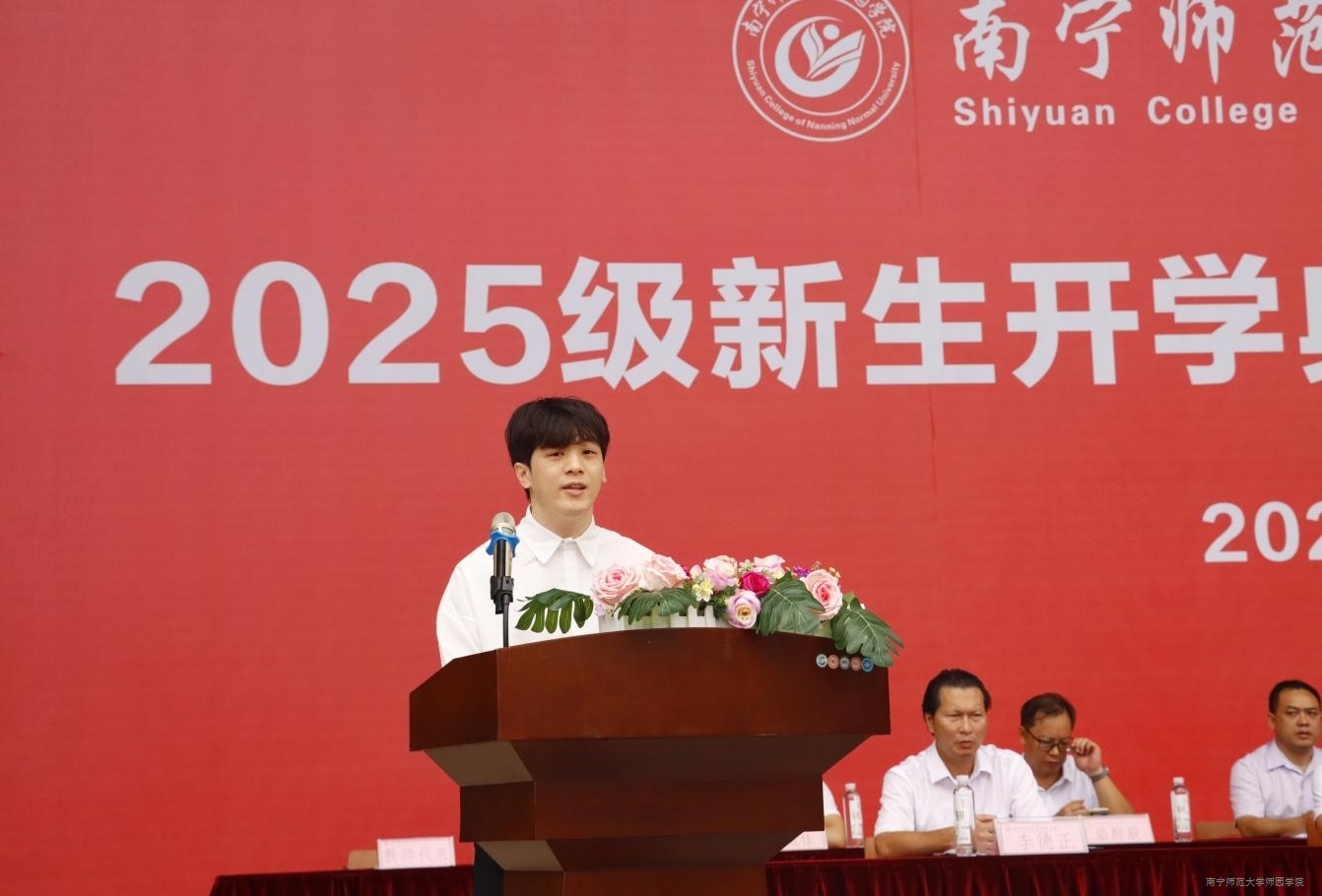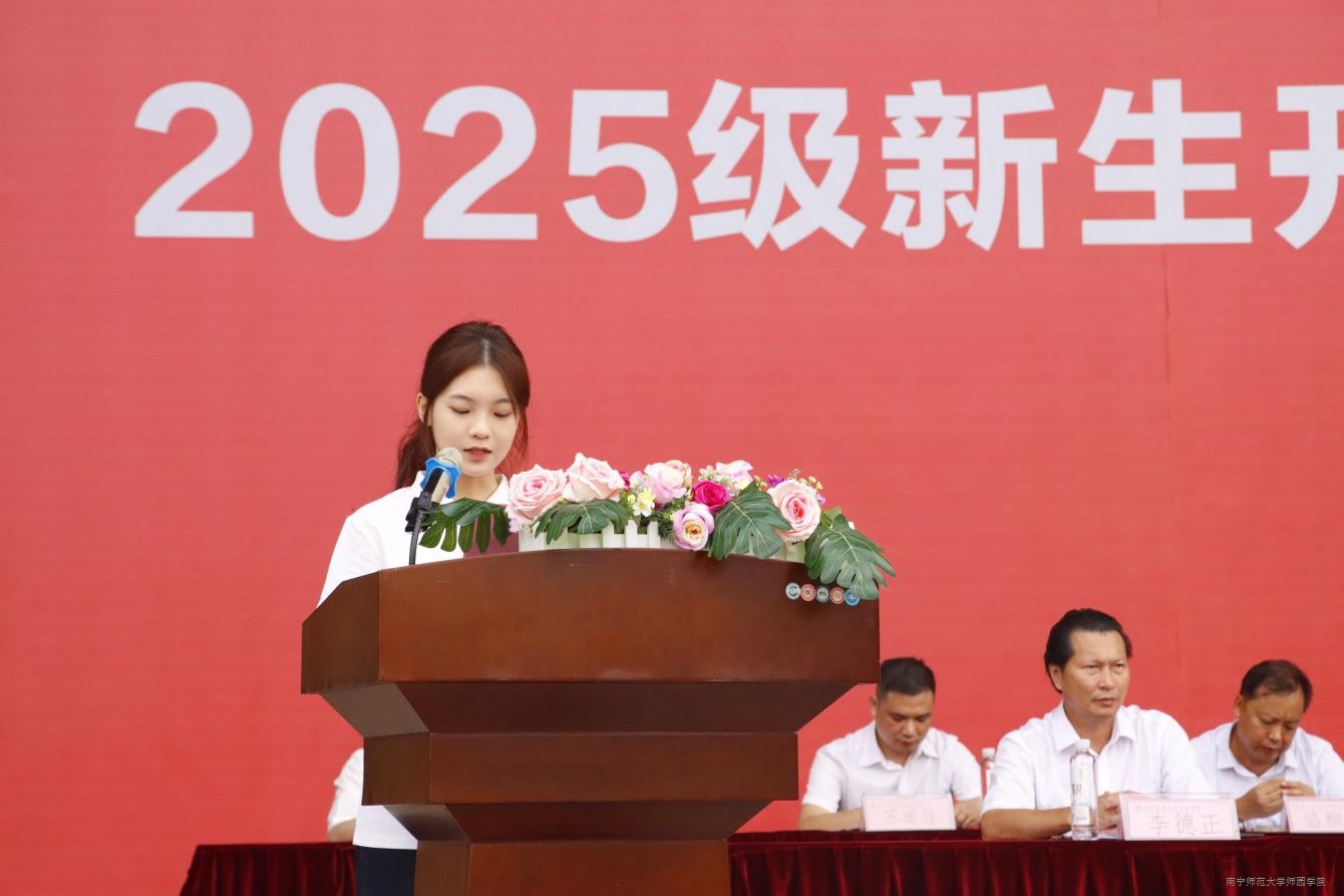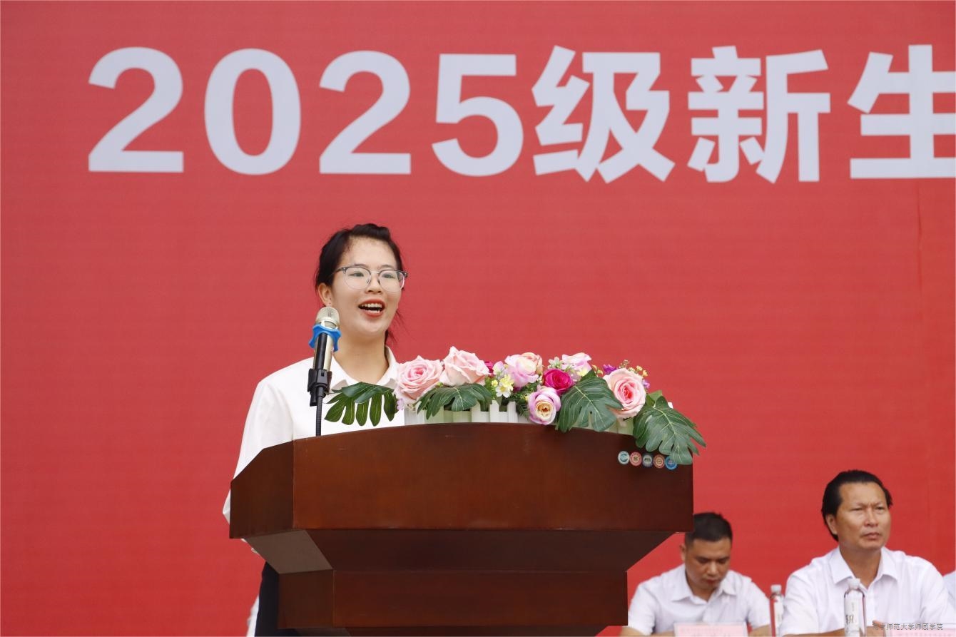 外语系教师叶泳余作教师代表发言。他以师长身份嘱咐新生要重拾读书本真,让深度学习成为习惯,主动钻研知识,构建知识体系;要拥抱多元可能,以全面成长为目标,积极参与学生团体、社会实践、创新创业等活动;要涵养独立精神,健全人格基石,形成自我价值判断。外语系英语专业2402班韦烷馨作为高年级学生代表发言,鼓励新生们主动学习与思考,在尝试中发现热爱,珍惜同学情谊,学会与人相处、与情绪相处,既能埋首经典,孜孜不倦;也能仰望星空,胸怀天下。教育系学前2502班的朱文意作为新生代表发言,倡议全体新生要尊师好学,笃定前行,投身实践,以奋进的姿态迎接大学新生活。