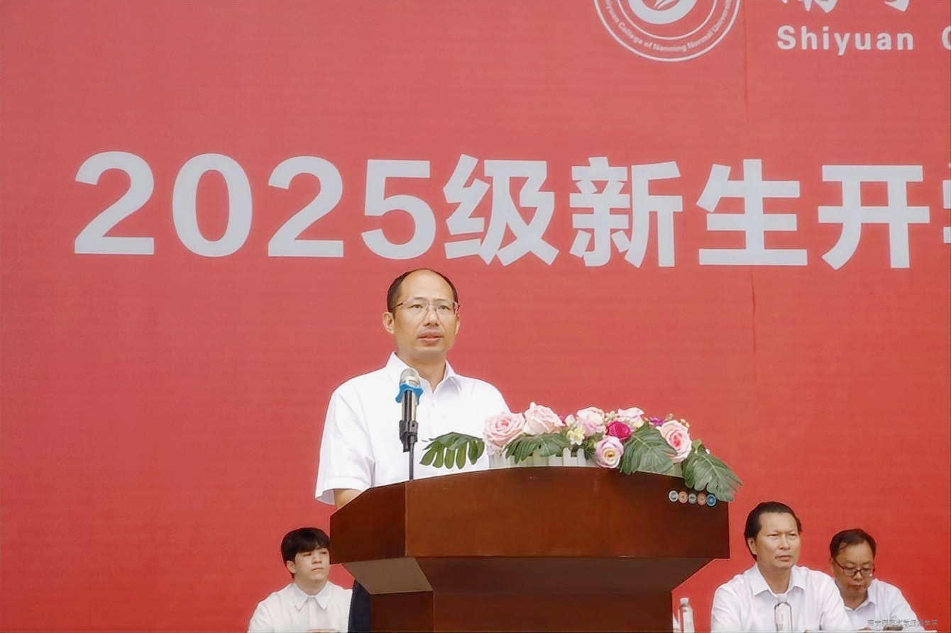 尹文嘉校长在典礼上作题为《立德修身扬正气,脚踏实地向未来》的重要讲话。他代表学校全体师生员工,向远道而来、加入师86体育直播大家庭的2025级新生表示热烈欢迎,并向2025级新生详细介绍了学校办学历程、学科特色、专业建设成果等办学成效和防城港新校区建设进展。尹文嘉校长鼓励2025级新生在人生的新征途中以“厚德”筑基,以“博学”蓄能,以“尚美”养心,以“笃行”逐梦。始终坚定理想信念,厚植家国情怀,勇担历史使命,努力成长为担当民族复兴大任的时代新人,奋力书写挺膺担当的青春篇章!
