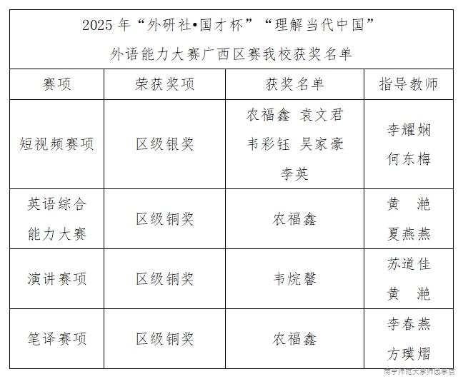 近日,2025年“外研社·国才杯”“理解当代中国”全国大学生外语能力大赛广西赛区比赛结果揭晓。我校外语系学子凭借扎实的语言功底、出色的综合能力与稳定的临场发挥,在比赛中表现优异,共斩获银奖1项、铜奖3项,为学校赢得了荣誉。