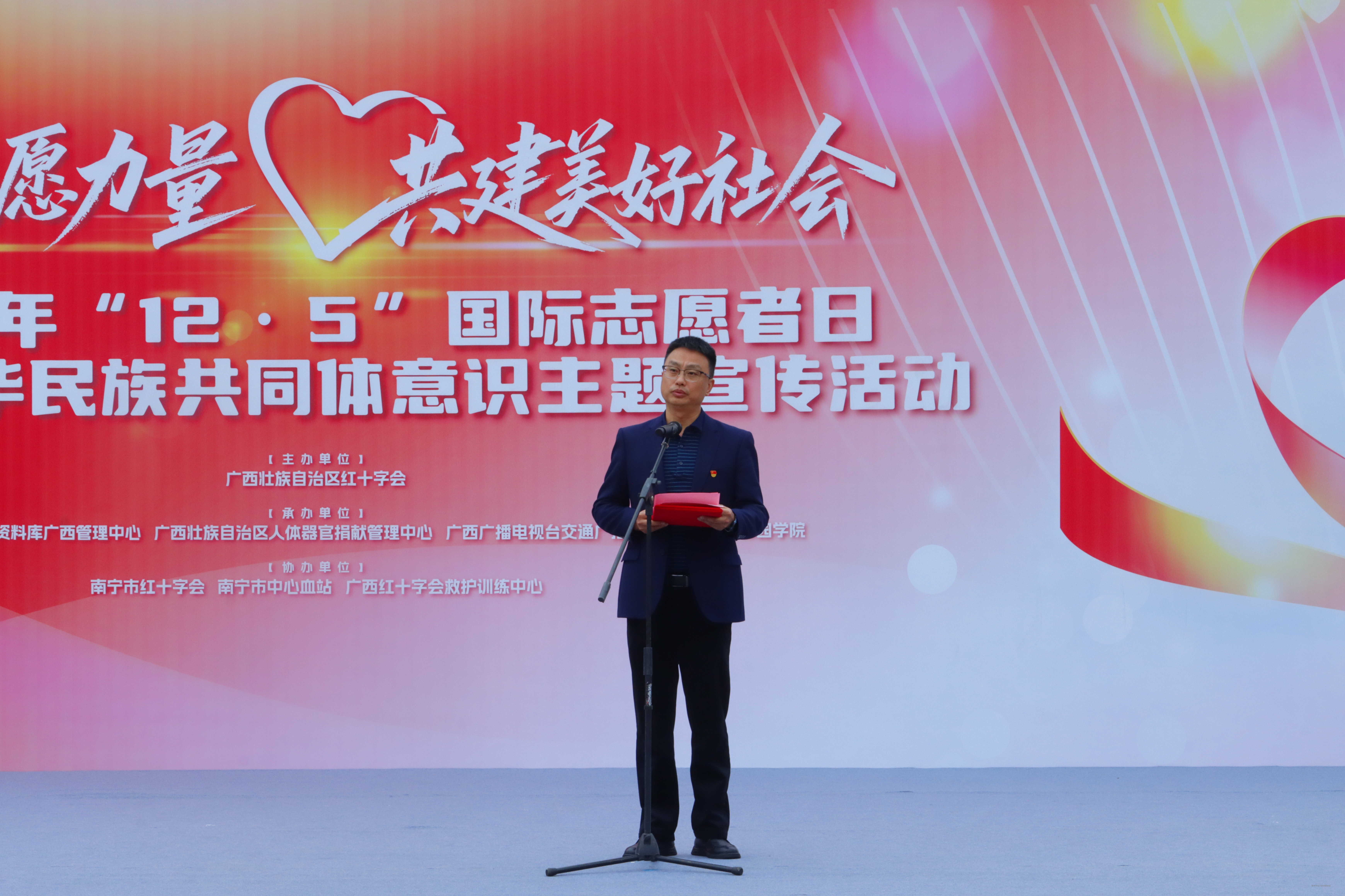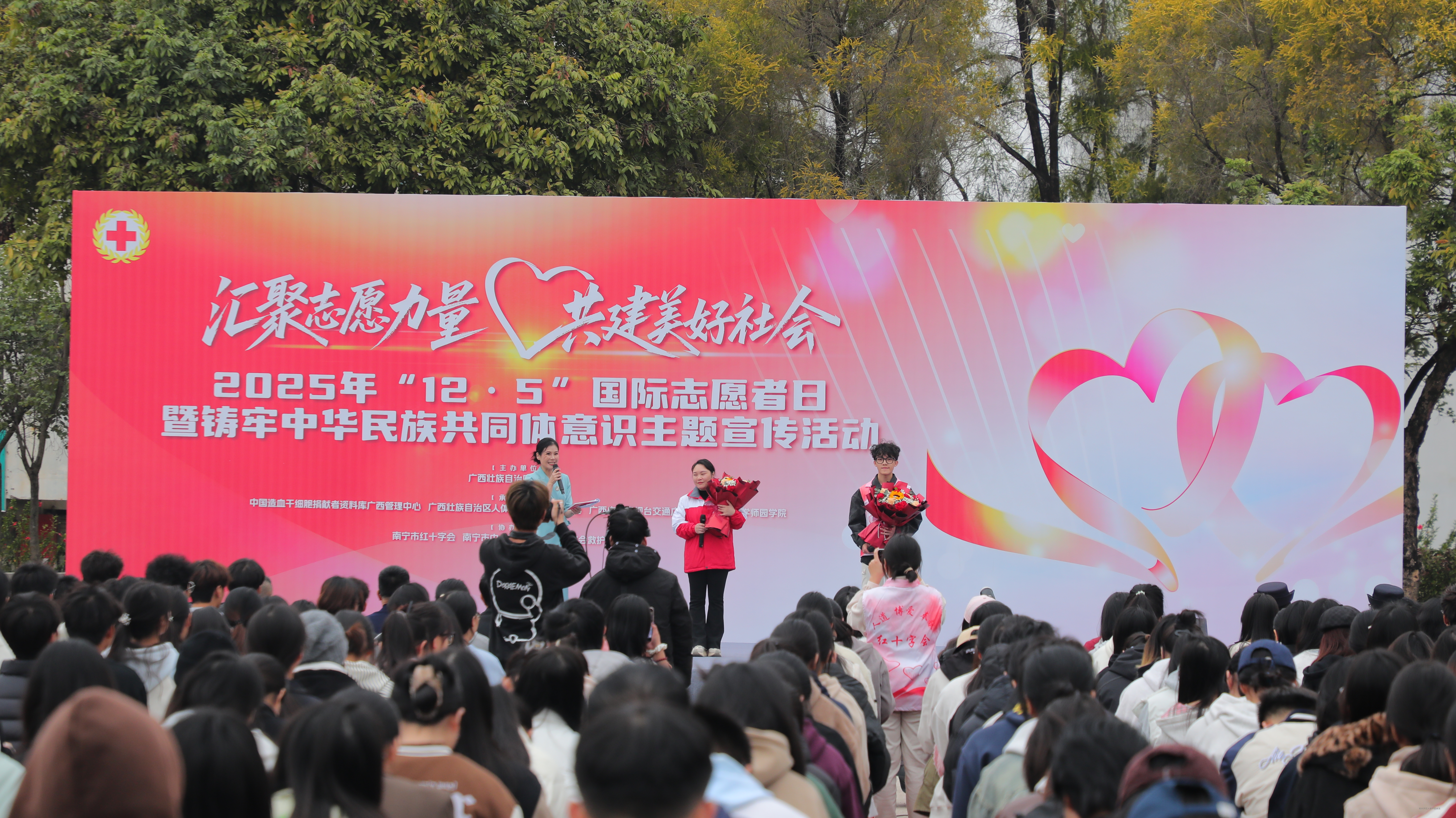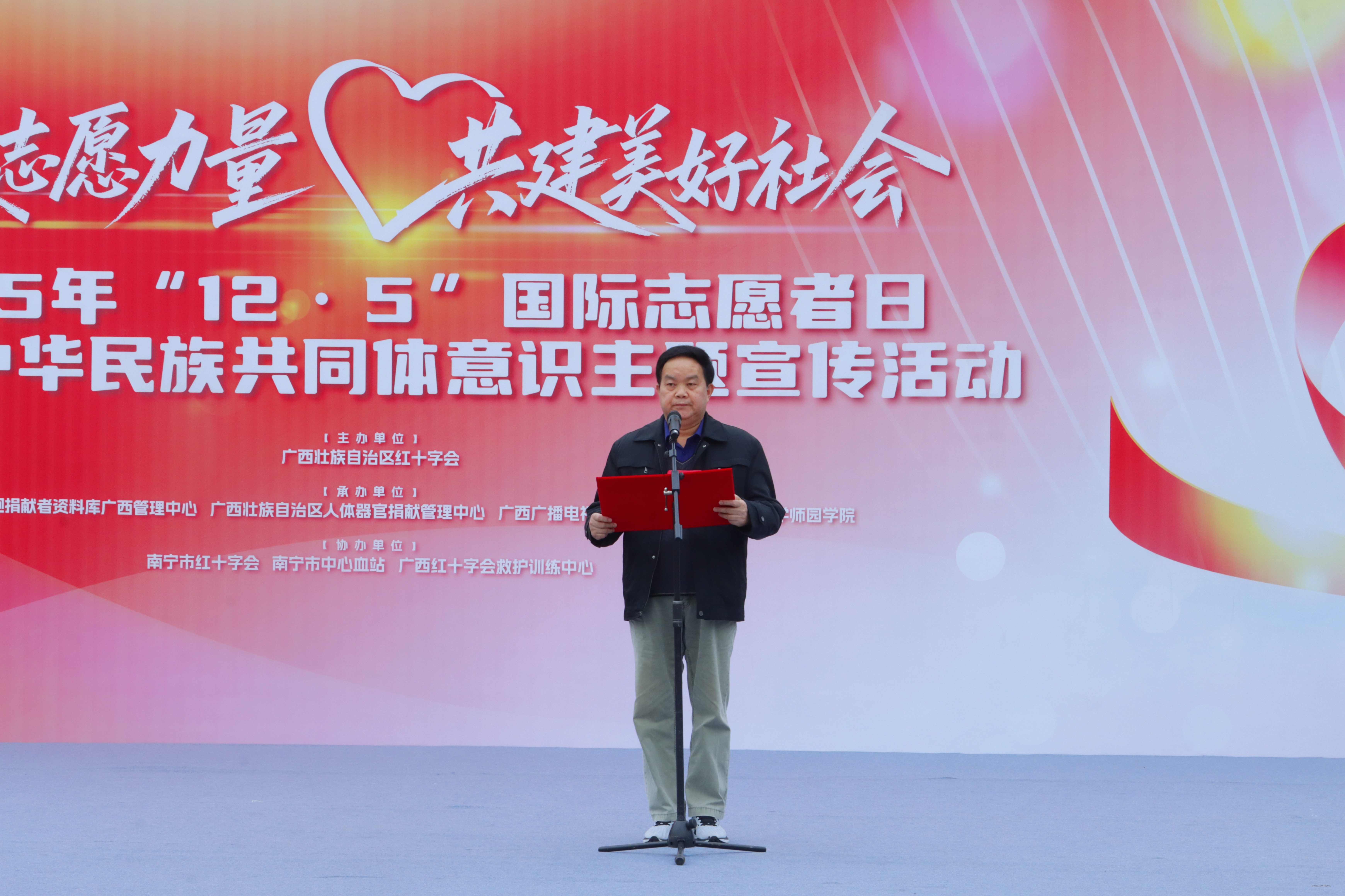 为深入贯彻落实党的二十届四中全会精神,大力弘扬志愿服务精神,12月5日,正值第40个“国际志愿者日”,我校在升旗广场举行“汇聚志愿力量,共建美好社会”2025年“12·5”国际志愿者日主题宣传活动。自治区红十字会党组成员、副会长兼秘书长吴强,学校党委副书记、常务副校长李剑喜出席活动并致辞,学校师生、志愿者代表约500人共同参加本次活动。