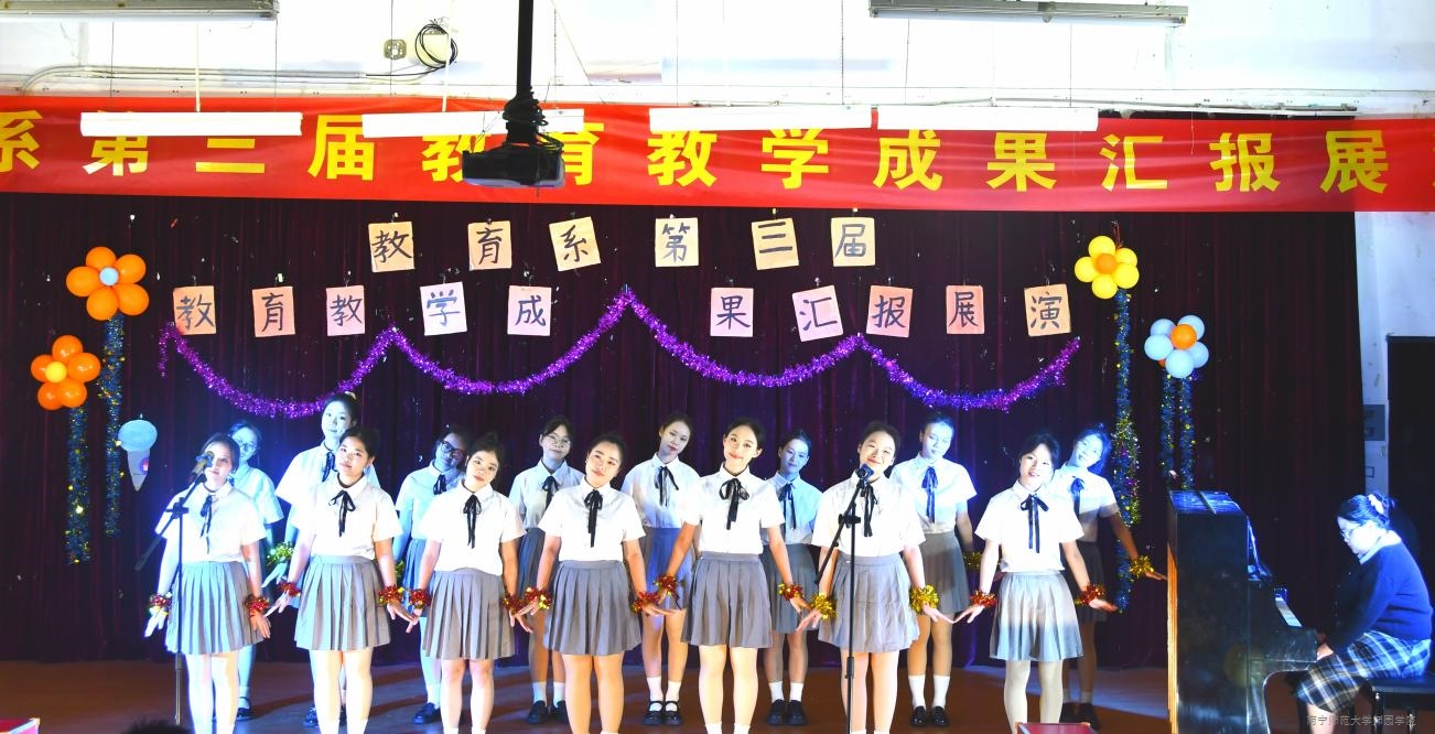 为激发同学们的青春热情,充分展现教育系教育教学成果,12月24日,教育系第三届教育教学成果汇报展演活动在4-108教室温情启幕。教室被精心装点,洋溢着欢快、热烈的氛围,教育系全体师生齐聚一堂,共赴这场青春与梦想的盛会。