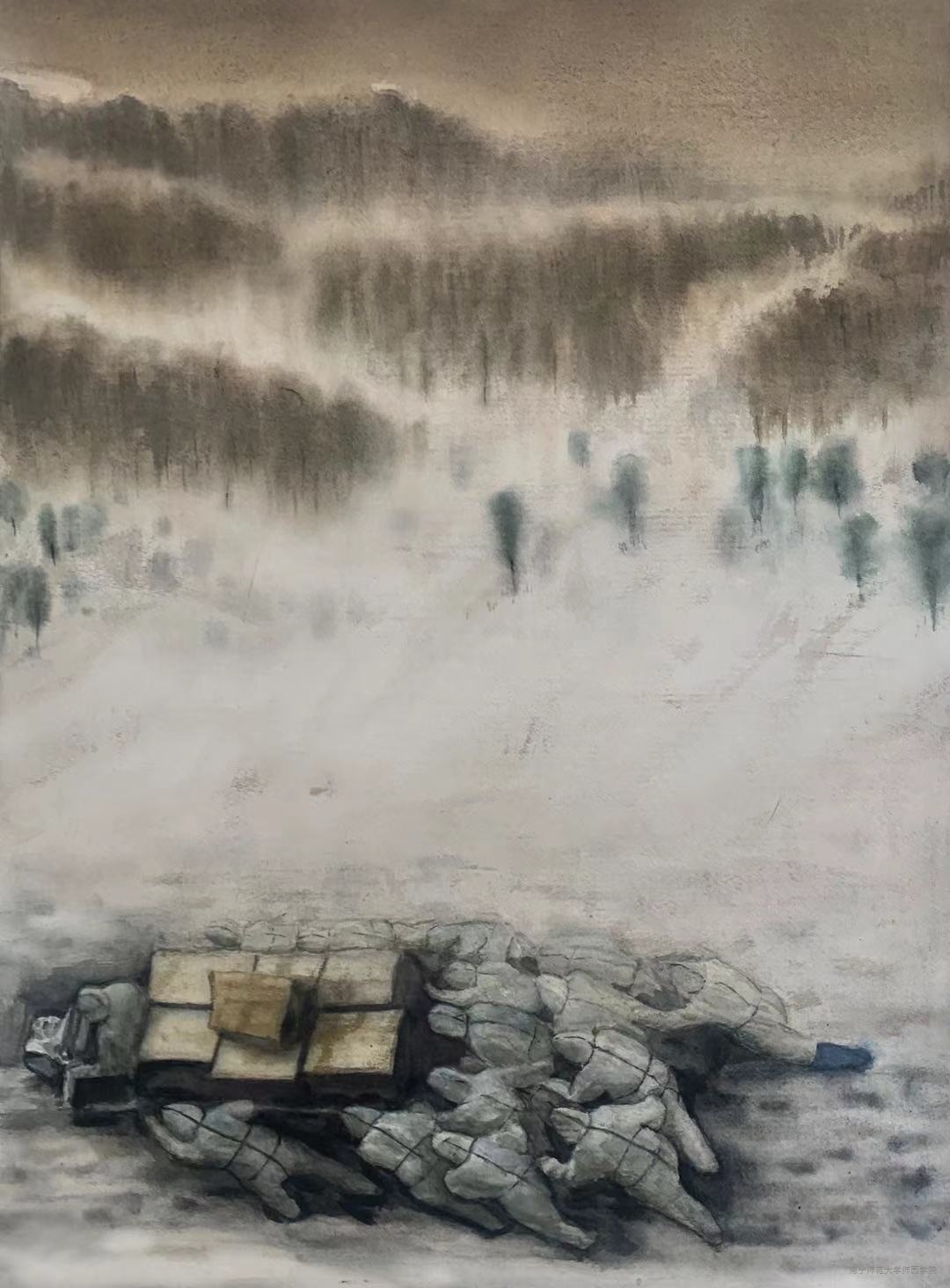 作品题目:《走过严冬——记抗疫大学生志愿者》作者:零敏(艺术系2018级美术学专业水彩方向)