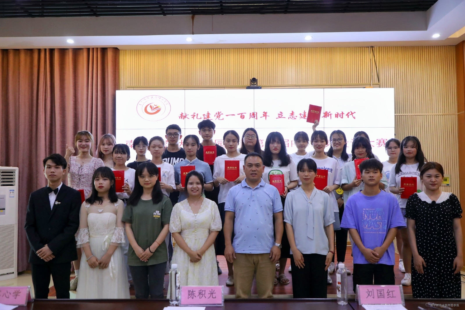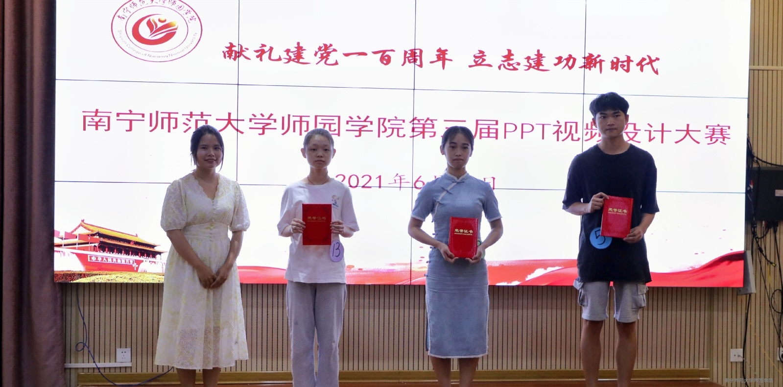 决赛现场,各参赛队伍通过播放精心创作的PPT视频,用不同视角和表达手法,向观众展现了对党的奋斗历程的认识和光辉历史回顾,表达了对党的热爱与敬仰。同时部分参赛队伍也通过以“坚定文化自信,展示璀璨民族文化”为参赛主题而进行创作的PPT视频展现了壮族传统节日、传统美食等民族文化,向观众们形象地展示了壮族丰富多彩的文化生活,从而进一步坚定了文化自信。决赛历时三个小时,最终在评委老师及大众评委公平公正的评选下,最终评出了一等奖1组,二等奖2组,三等奖5组。