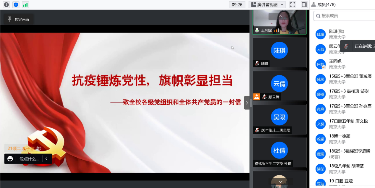 王阿妮副书记首先分析了当前校园疫情防控的形势,解读、强调了学校疫情防控政策,并介绍了医学院近期在防疫方面所做的一系列工作。随后,王阿妮副书记带领全体党员学习了《抗疫锤炼党性,旗帜彰显担当——致全校各级党组织和全体共产党员的一封信》,这封信从“提高政治站位,坚决扛起疫情防控政治责任”、“发挥组织优势,切实筑牢疫情防控最强堡垒”、“践行初心使命,充分发挥党员师生先锋作用”三方面,对疫情期间学校基层党组织建设和每位党员同志的言行提出了要求。