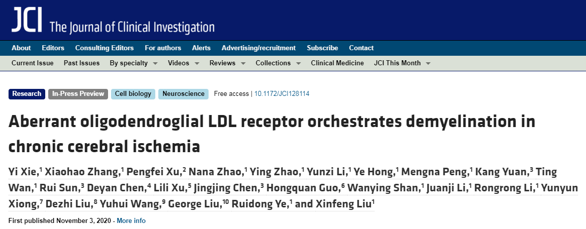 1. Xie Y, Zhang X, Xu P, et al, Aberrant oligodendroglial LDL receptor orchestrates demyelination in chronic cerebral ischemia. J Clin Invest. 2020 Nov 3;128114. doi: 10.1172/JCI128114. Online ahead of print.