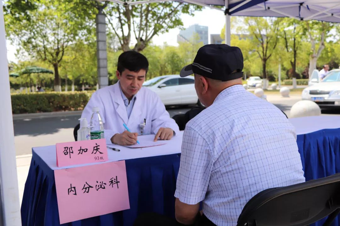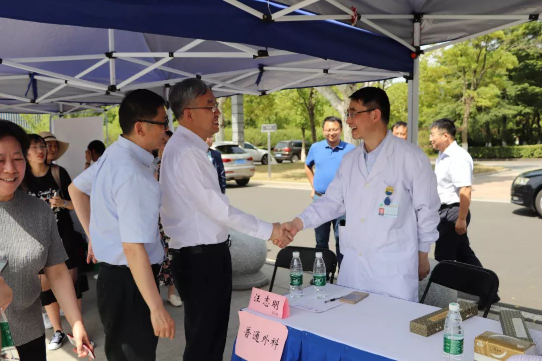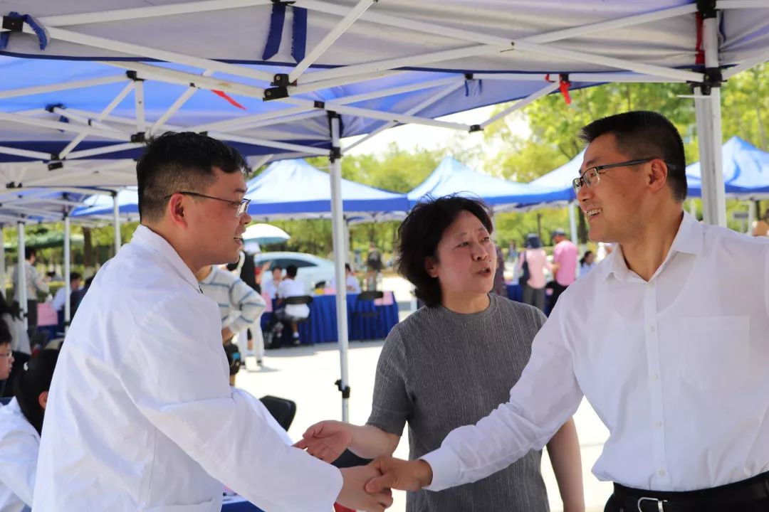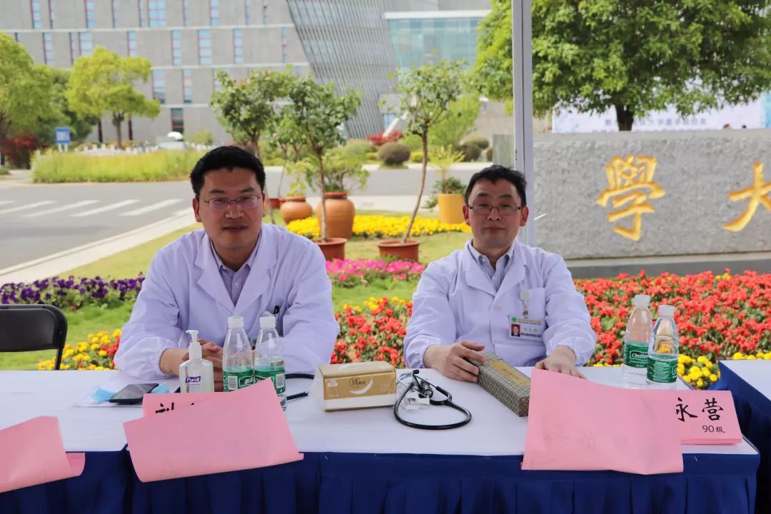 5月24日下午,炎炎烈日炙烤着大地,气温持续升高。南京大学仙林校区二源广场上,由南京大学医学院主办的“大医精诚,饮水思源”——第七届南京大学医学院校友回馈母校大型义诊及健康咨询活动拉开帷幕,为南京大学117周年校庆增添了节日的气氛。天气虽然酷热难耐,现场的校友们依然顶着烈日坚持义诊,前来咨询的人群也是络绎不绝。南京大学校长吕建、党委副书记薛海林、党办主任王云骏、校友会秘书长张锁庚,南京大学副校长/医学院院长张峻峰、医学院党委书记韩晓冬、副院长沈苏南、党委副书记王阿妮等领导老师莅临义诊现场慰问在现场工作的各位医学院校友,并为前来就诊的师生、群众带来了亲切的问候。