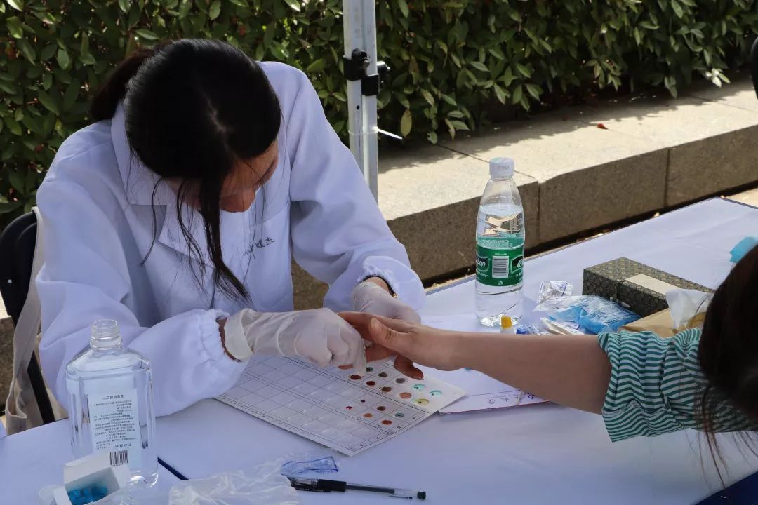 现场还有检验科测血型和来自医学院大三大四的学长学姐们组成的导医与血压测量小分队。