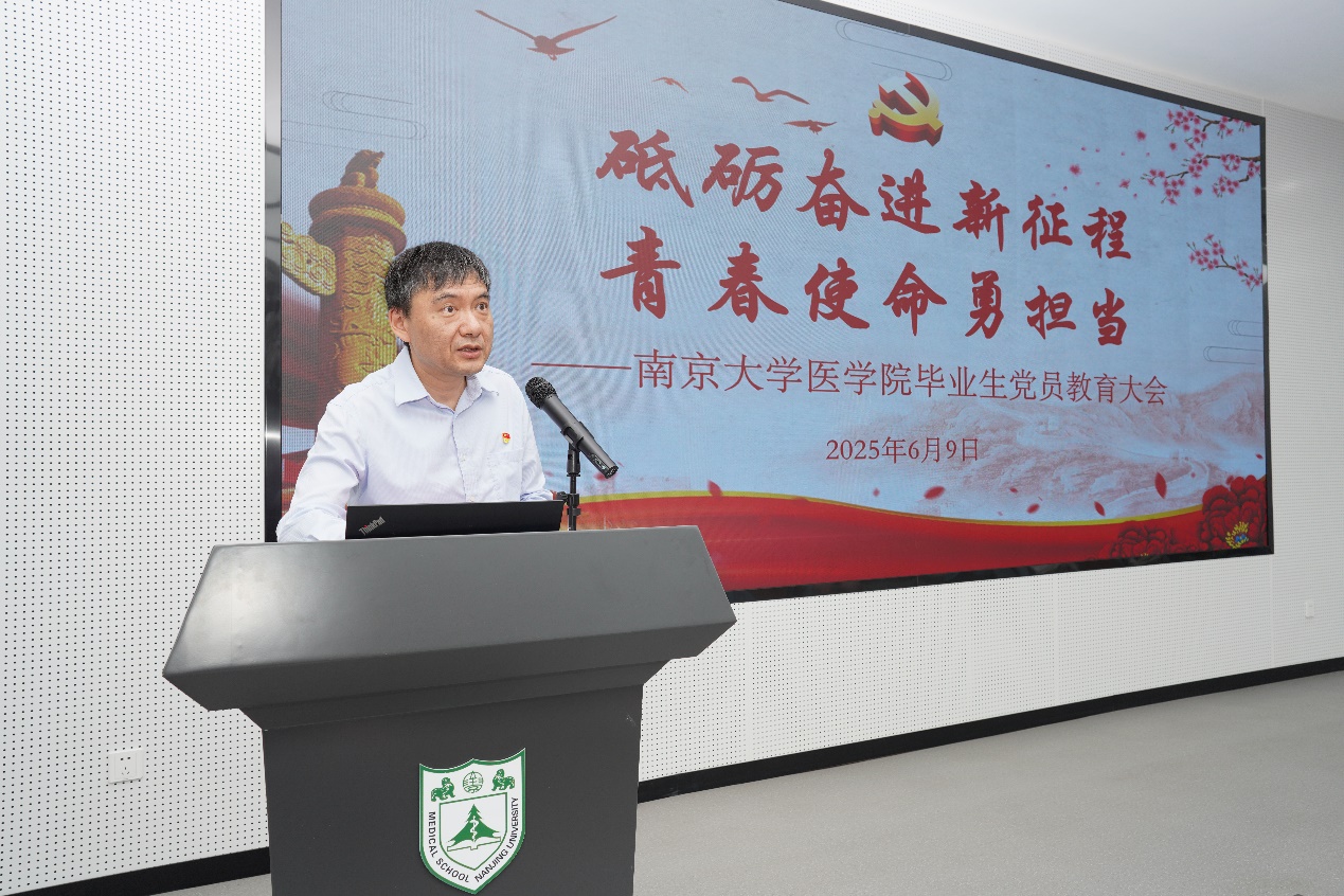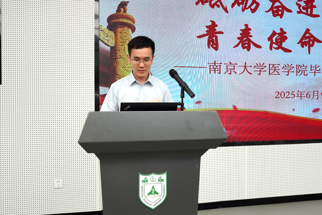 沈苏南代表学院党委勉励同学们牢记“三重身份”赋予的使命。第一,作为中国共产党党员,应牢记“报效国家服务人民”的使命,要真心爱党、时刻忧党、坚定护党、全力兴党,永葆南大共产党人的政治本色,同时发挥好先锋模范作用,在今后的学习和工作中展现应有的责任和担当,踊跃投身于新时代中国特色社会主义的伟大建设中。第二,作为医学工作者,要牢记“健康所系性命相托”的誓言。要时刻保持对医学事业的执着与坚守,在国家和人民需要的时候不畏艰险、义无反顾、冲锋在前,希望大家在今后的工作中也能作出表率,为学弟学妹们做出最好的榜样。第三,作为南京大学的校友,要牢记“诚朴雄伟,励学敦行”的校训,践行“心系‘国家事’,肩扛‘国家责’”的报国使命,以南大人特有的社会责任感和使命感投身改革创新的时代大潮。同时,他也表达了对毕业生们的美好祝愿,并希望大家能一直心系母校、学院的发展,常回家看看,为学校学院的发展建言献策,为建设“第一个南大”贡献力量。