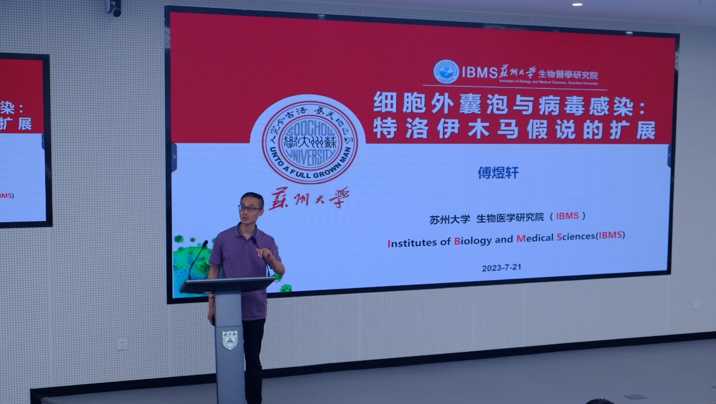 苏州大学傅煜轩副教授是南京大学医学院吴稚伟教授课题组的优秀博士毕业生,在工作岗位上延续南大医学院的研究成果,他为与会师生作了一场关于“细胞外囊泡与病毒感染:特洛伊木马假说的扩展” 精彩报告。