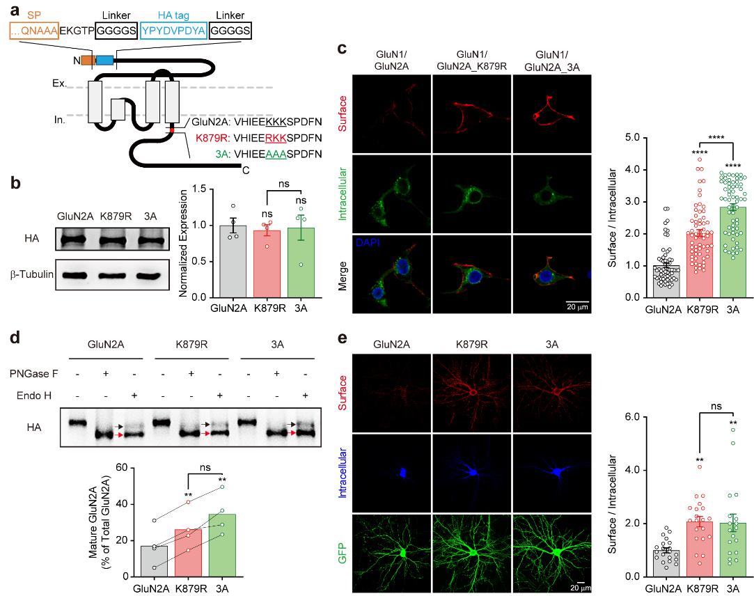 在脑内,NMDA受体主要分为GluN2A和GluN2B两种类型。这两种类型的NMDA受体在通道动力学上有所不同,GluN2A失活比GluN2B快,其介导的Ca2+信号可能相对较弱。课题组在一个智力发育迟缓的儿童发现了GluN2A的一个罕见突变(K879R),即879位点的赖氨酸(K)突变成了精氨酸(R)。由于赖氨酸和精氨酸都是带正电的碱性氨基酸,该突变不改变GluN2A受体的通道性质。然而879位点的K位于一个KKK879-881的赖氨酸三联体上,实验证明该赖氨酸三联体是一个内质网滞留信号,其作用是减缓新合成的GluN2A受体运输到细胞膜上。K879R突变破坏了这个信号,因而受体的上膜运输加快,在细胞膜上的GluN2A受体增多(图1)。
