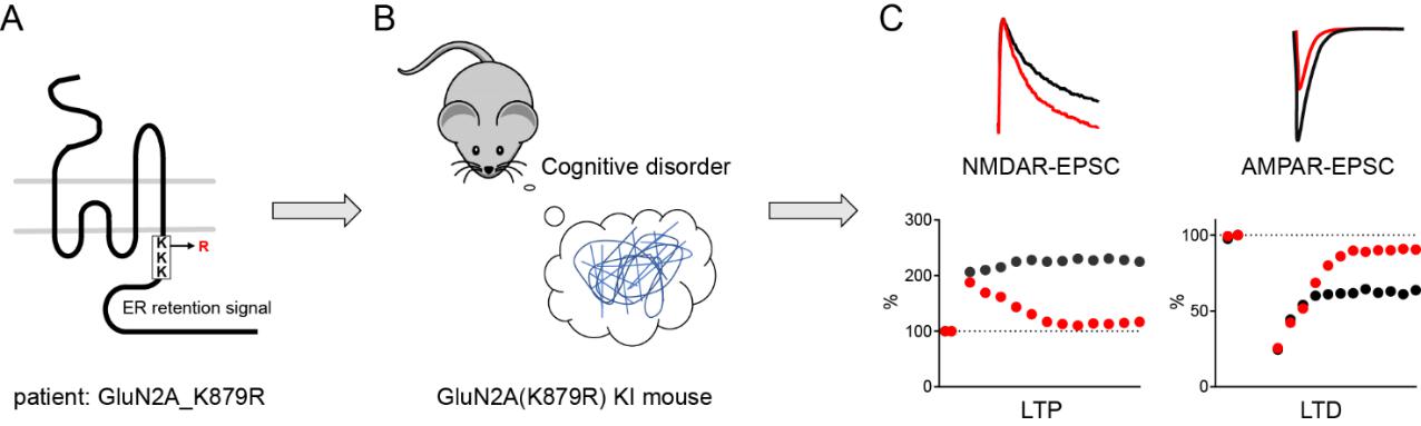 图1. 在智力发育迟缓的病人中找到一个基因突变(GluN2A_K879R),该突变造成GluN2A-NMDA受体上膜加快,在细胞膜上的表达升高。