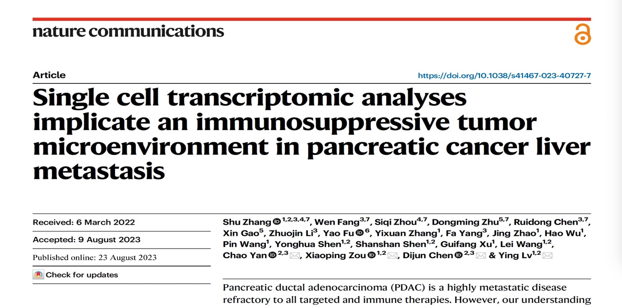 2023年08月23日,南京大学医学院附属鼓楼医院吕瑛教授、邹晓平教授同生命科学学院陈迪俊教授、闫超教授合作在Nature Communications杂志在线发表了题为Single cell transcriptomic analyses implicate an immunosuppressive tumor microenvironment in pancreatic cancer liver metastasis的研究论文。该研究对PDAC配对的原发性和转移性肿瘤样本的肿瘤微环境中不同细胞成分和功能表型进行了全面的描述,不仅促进了对转移性PDAC的免疫抑制微环境机制的深入理解,并可以作为设计新型靶向治疗的宝贵资源,为提高PDAC肝转移患者的生存率奠定基础。南京大学医学院附属鼓楼医院消化科吕瑛教授、邹晓平教授、生命科学学院陈迪俊教授、闫超教授为本文的共同通讯作者。南京大学医学院附属鼓楼医院张舒博士、生命科学学院博士生方雯、江苏大学博士生周思琦、苏州大学附属第一医院朱东明主任以及南京大学生命科学学院硕士生陈瑞东为本文的共同第一作者。