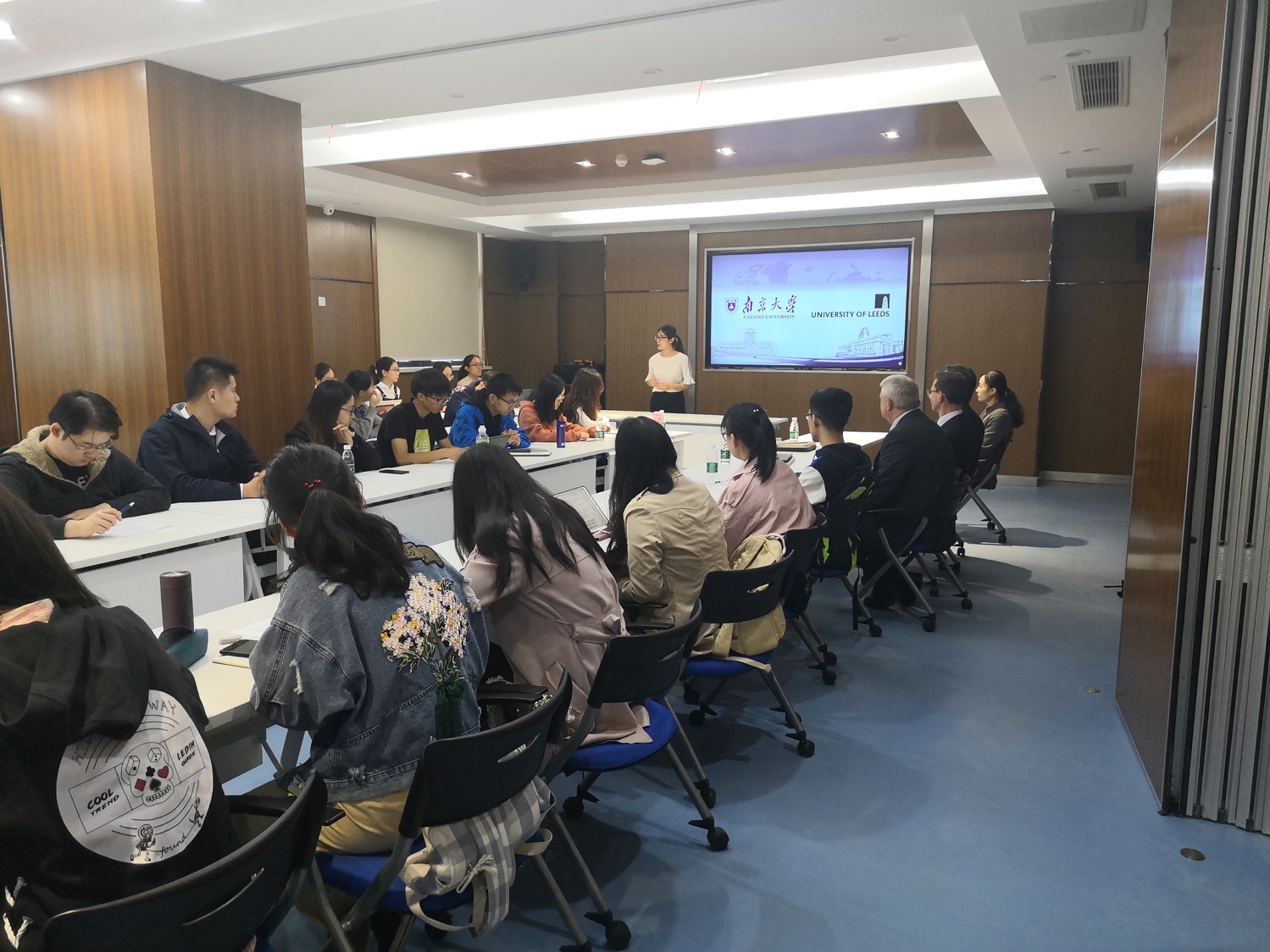 会后,利兹大学牙医学院代表团出席了我院口腔医学专业本科生见面会,我院王婷婷副院长及30余名口腔专业学生代表参加。杨学斌副教授介绍了利兹大学牙学院研究生课程培养具体情况。各年级学生分别展示了本科暑期实践、本科创新计划、硕士课题研究以及虚拟根尖片投照平台现场演示。我院口腔医学专业学生代表大方、精彩的演讲受到英国来宾的连连称赞。会上,英国来宾还对学生们关心的中英双学位培养的问题进行了详细的说明。