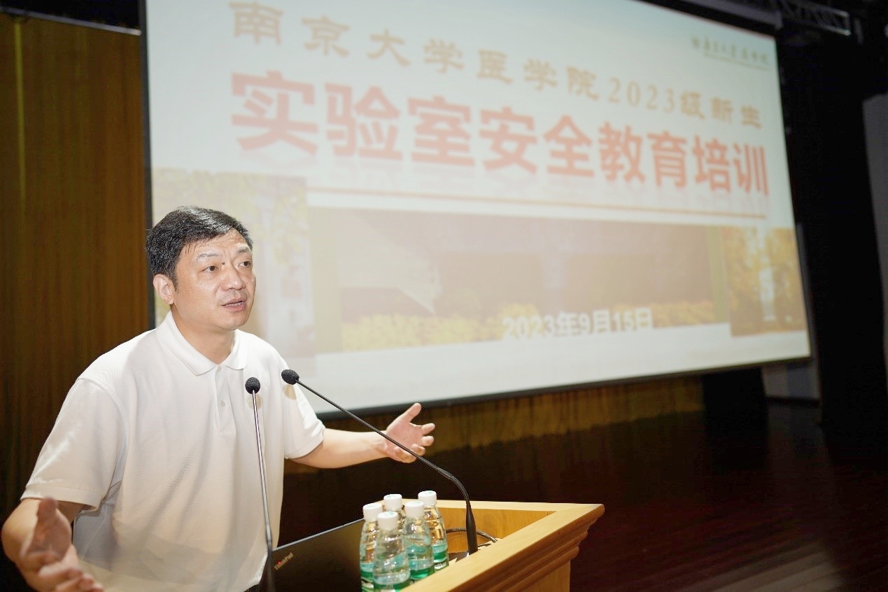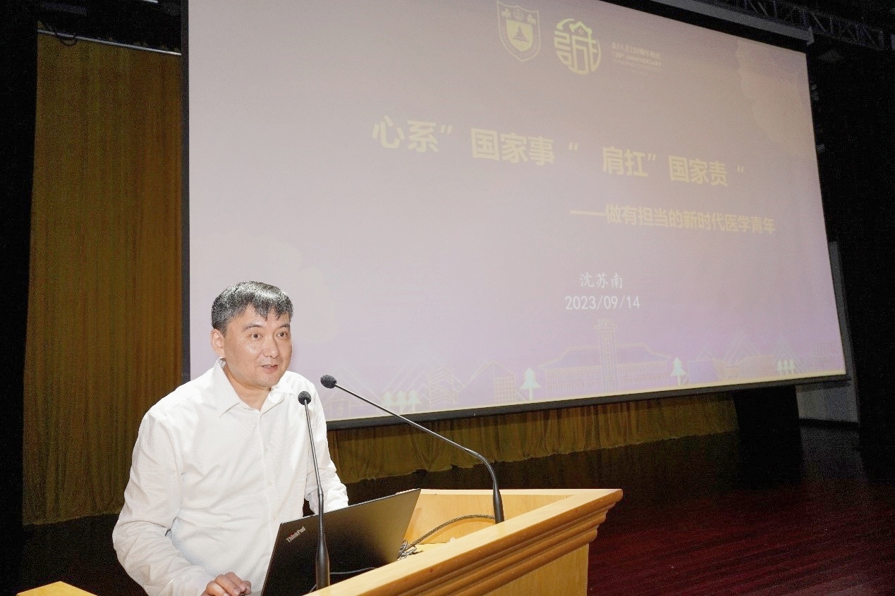 在入学教育大会上,沈苏南书记为新生上“开学第一课”。他以《心系“国家事”,肩扛“国家责”——做有担当的新时代医学青年》为题,详细介绍了南京大学及医学院的发展历程、医学院的组织架构、教学科研水平以及学生就业情况。沈书记寄语全体医学生应带着习近平总书记给南大留学归国青年学子的回信中的殷切嘱托,运用自身专业知识,以南京大学“奋进行动”为契机,讲好南京大学故事,讲好医学院故事。