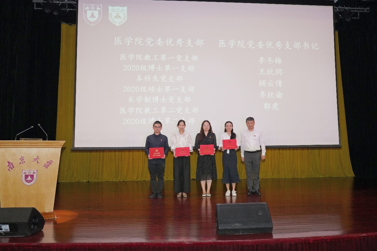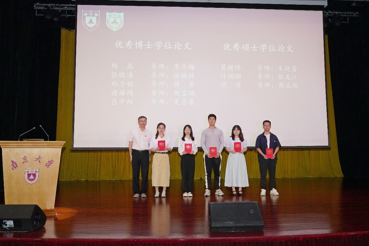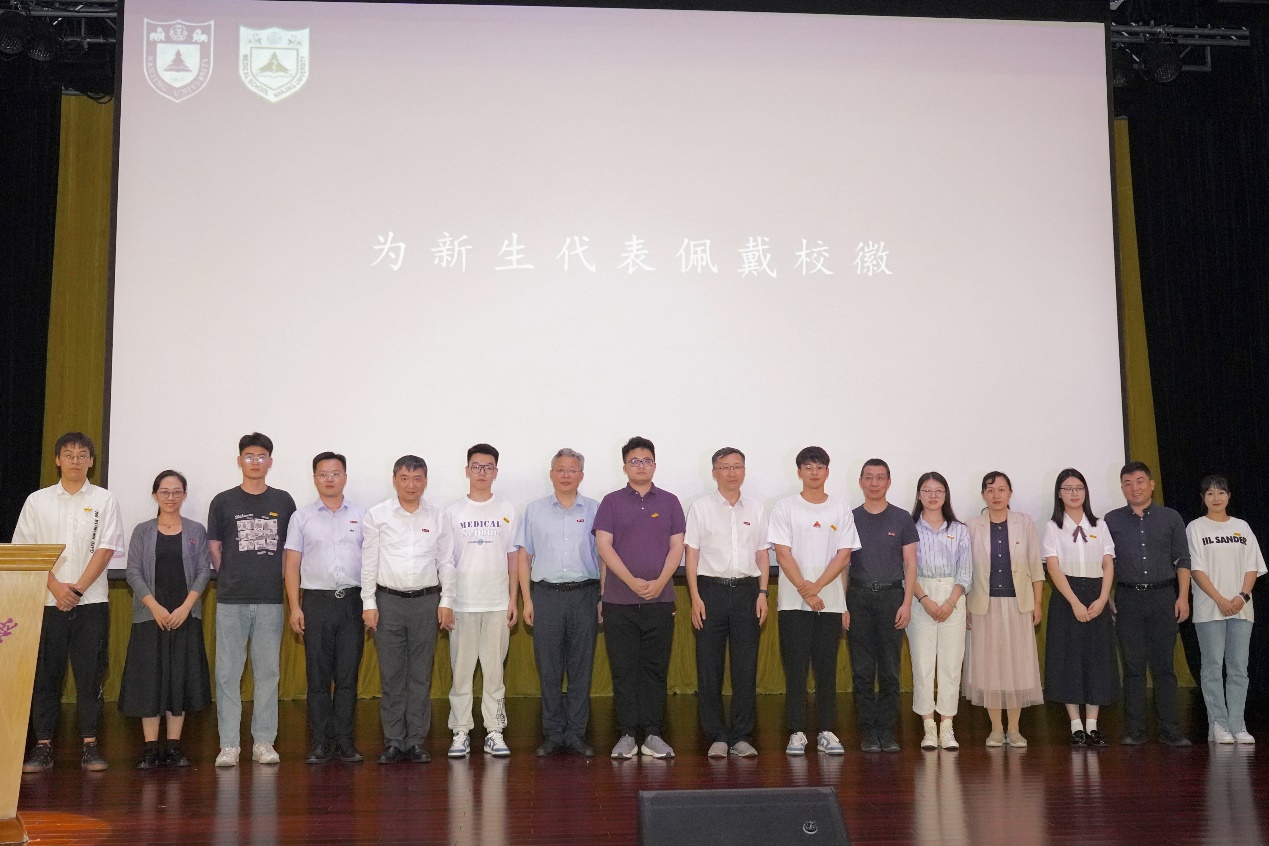 随后,与会领导和嘉宾为新生代表佩戴校徽。蒋青副院长宣读关于表彰2023年校优秀博士硕士学位论文作者及指导教师的决定和医学院党委党内表彰决定。在对获奖教师和学生代表进行表彰后,2023级博士研究生沈韬带领全体新生进行庄严的医学生宣誓。最后,开学典礼在集体奏唱南京大学校歌中落下帷幕。