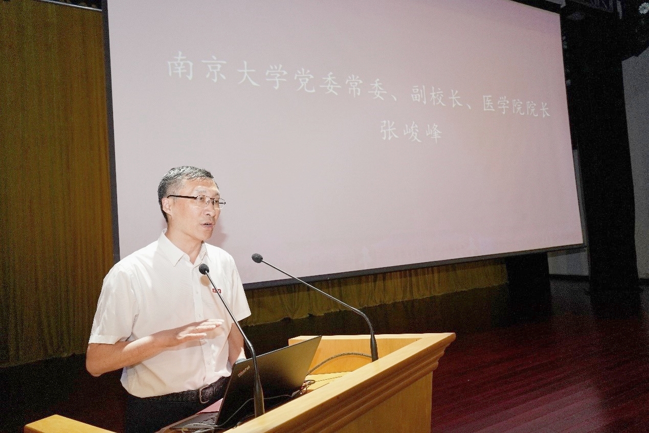 张峻峰首先致辞,他代表医学院全体师生对新生的到来表示热烈欢迎。他回顾了南京大学医学院的发展历程,并指出南京大学始终与时代同呼吸、与民族共命运,谋国家之强盛、求科教之进步,希望新生在南大深厚的人文底蕴中汲取养分,支撑未来职业生涯发展。他对新生提出三点期望:一是保持好奇探索之心和科学严谨的态度;二是广泛涉猎跨学科知识,助力医学学科发展;三是常怀济世情怀,做有温度的医生。他鼓励同学们充分利用好南京大学医学院的优质资源,全力以赴,只争朝夕,做与时代同向,与祖国同行,勇担历史使命的追梦人。