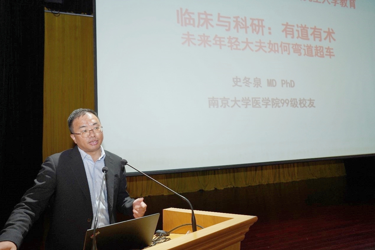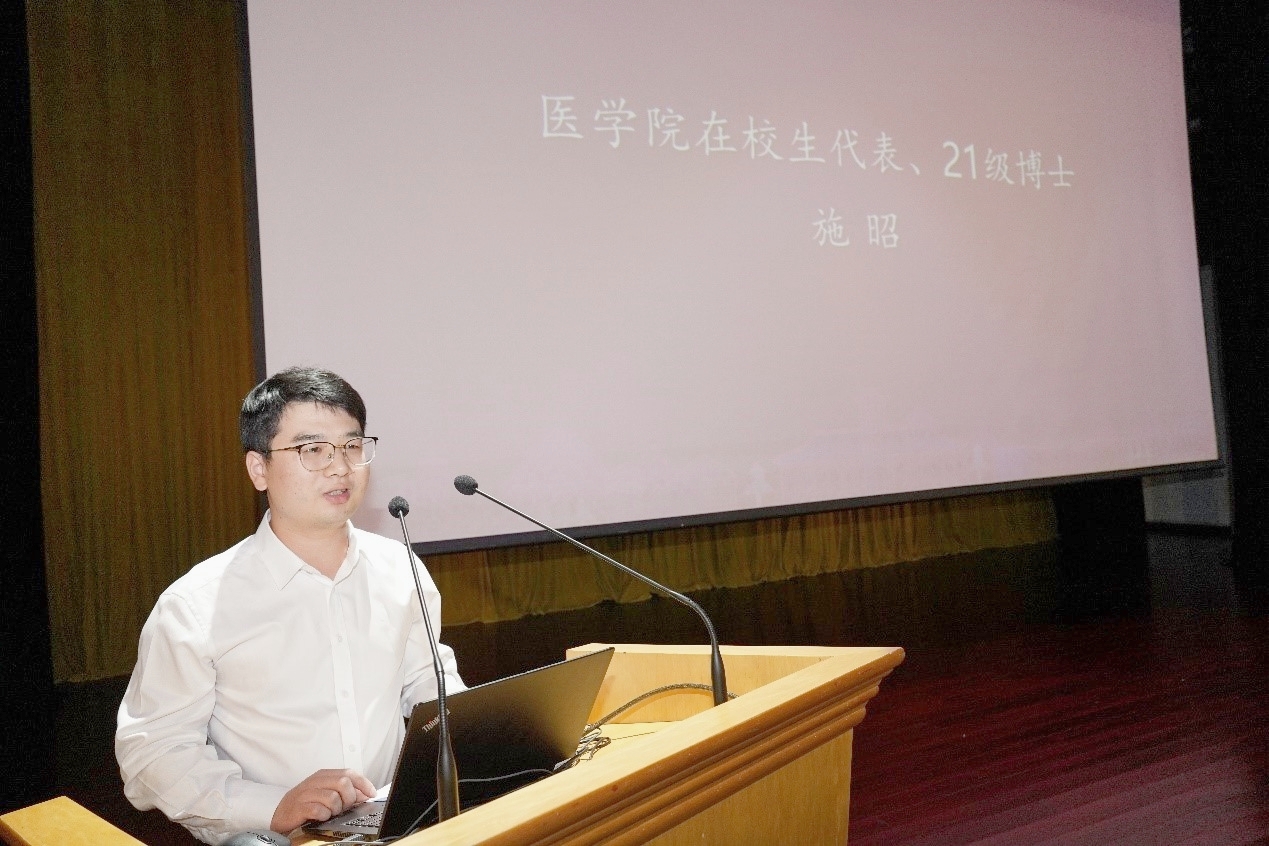 医学院校友代表史冬泉教授结合自身经历,鼓励同学们不断探索新理论、新机制、新方法,提升自身专业本领和技术能力。要怀有开放合作的包容态度,并充分利用周围的环境和资源以发展和提高自身,强调了良师对学生的巨大影响,鼓励学生多向良师学习。
