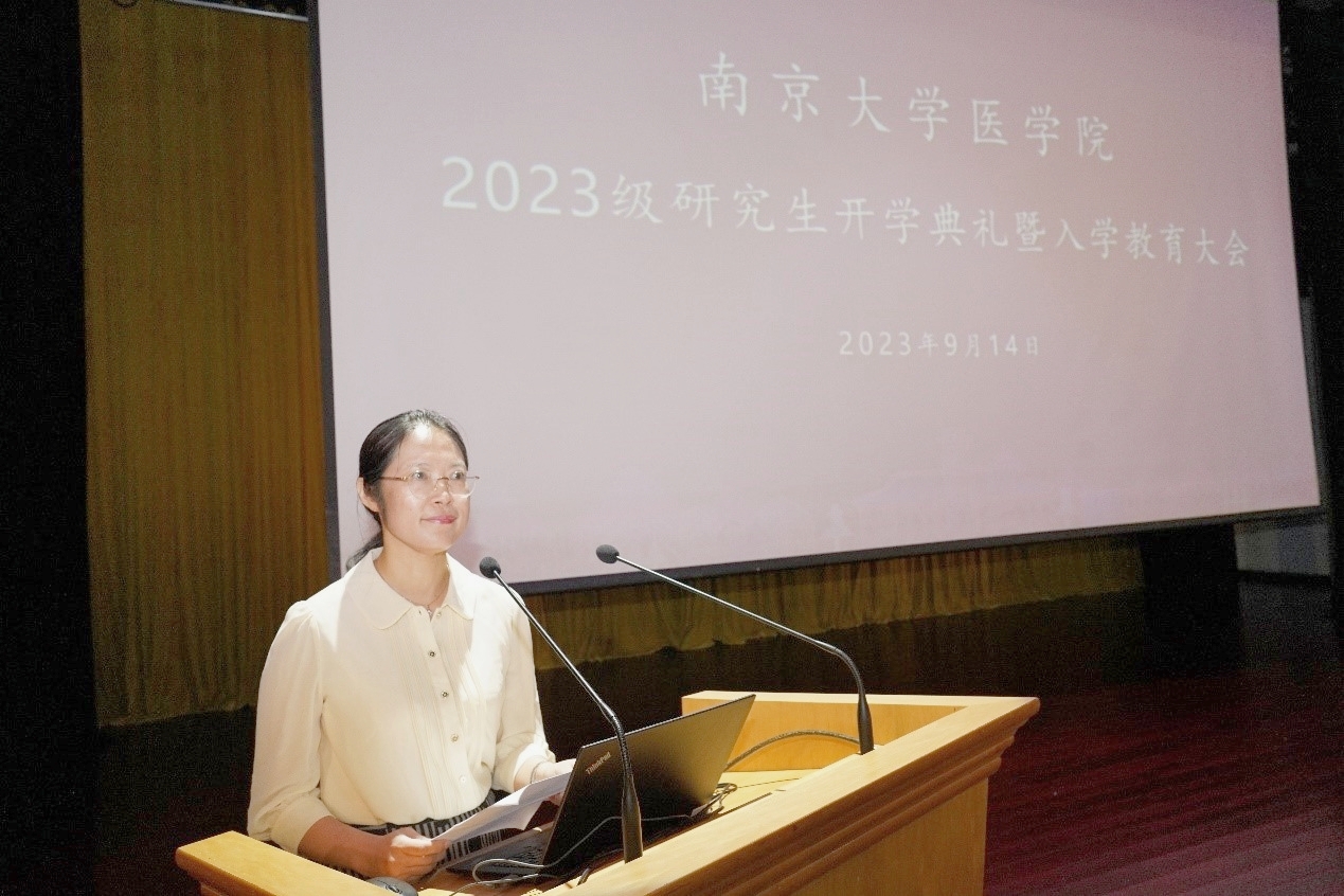随后,与会领导和嘉宾为新生代表佩戴校徽。蒋青副院长宣读关于表彰2023年校优秀博士硕士学位论文作者及指导教师的决定和医学院党委党内表彰决定。在对获奖教师和学生代表进行表彰后,2023级博士研究生沈韬带领全体新生进行庄严的医学生宣誓。最后,开学典礼在集体奏唱南京大学校歌中落下帷幕。