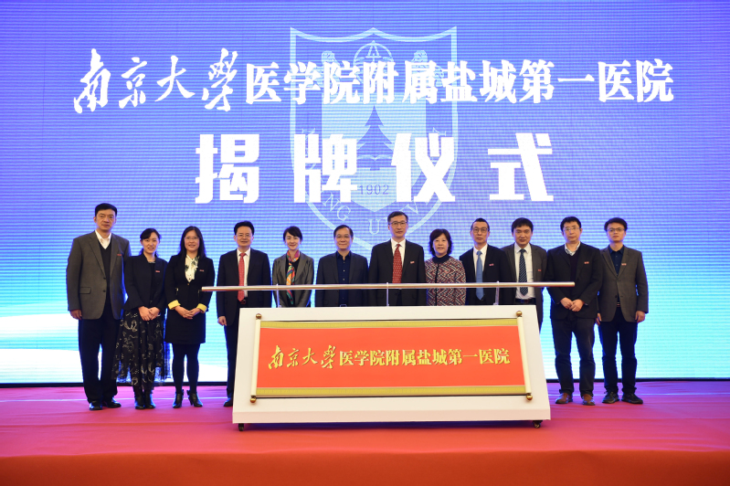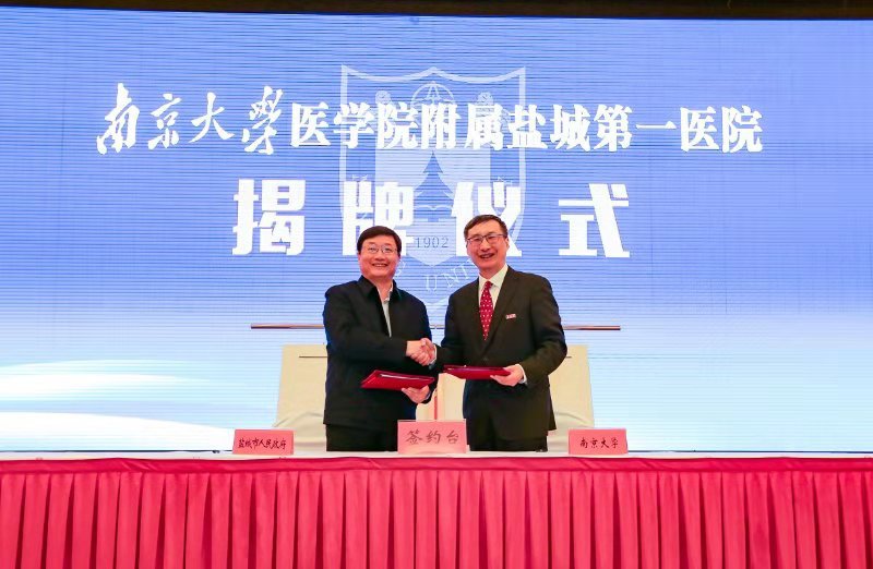 张峻峰与葛启发代表双方签订“南京大学、盐城市人民政府建立南京大学医学院附属盐城第一医院”协议书。与会嘉宾共同为“南京大学医学院附属盐城第一医院”揭牌。