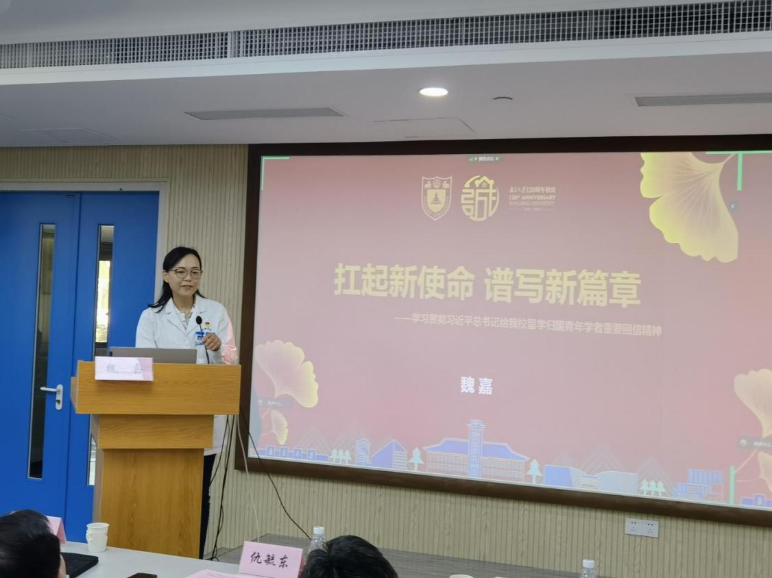 附属鼓楼医院德育导师魏嘉教授回顾了自己的留学生涯和归国经历。她用她自己的留学经历向医学生们讲述了爱国报国的使命情怀,传递了“出国后更爱国,努力奋进讲好中国故事”的爱国精神。