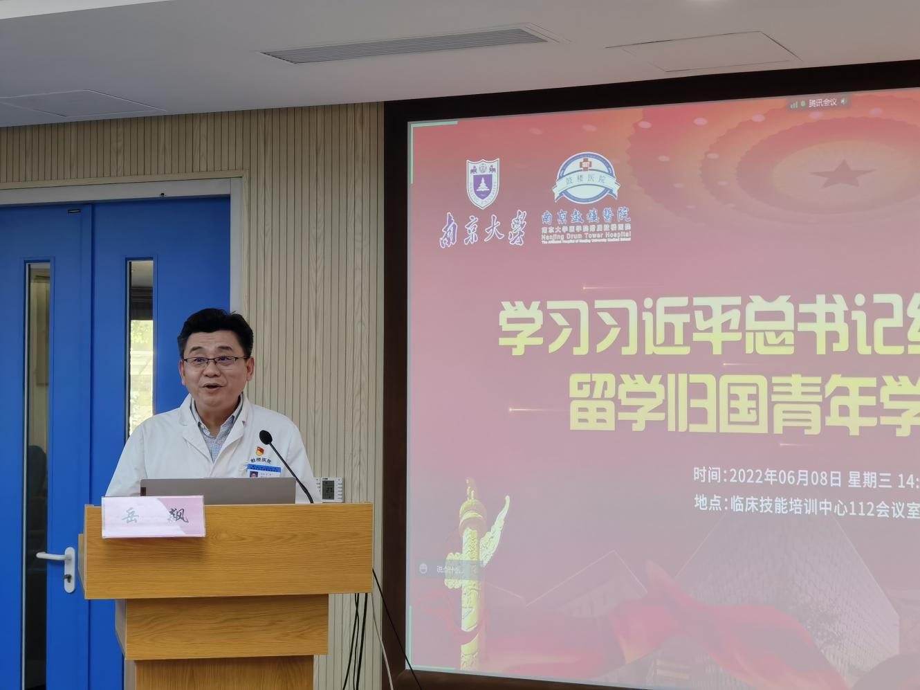 附属鼓楼医院院党委委员、纪委书记岳飚书记领学习近平总书记给南京大学留学归国青年学者的回信。他强调,回信饱含总书记对南大青年学子们的殷殷期盼和深切关怀,是对广大留学归国青年坚守报国初心、继承优良传统、厚植家国情怀的由衷肯定,同时也对留学归国人才发挥更大作用、作出更大贡献提出要求与希望。最后他鼓励在场的医学生们要从回信精神中领悟深刻内涵,努力学习、锤炼本领,争做新医科背景下的高素质医学人才,努力为实现中华民族伟大复兴的中国梦贡献青春力量。