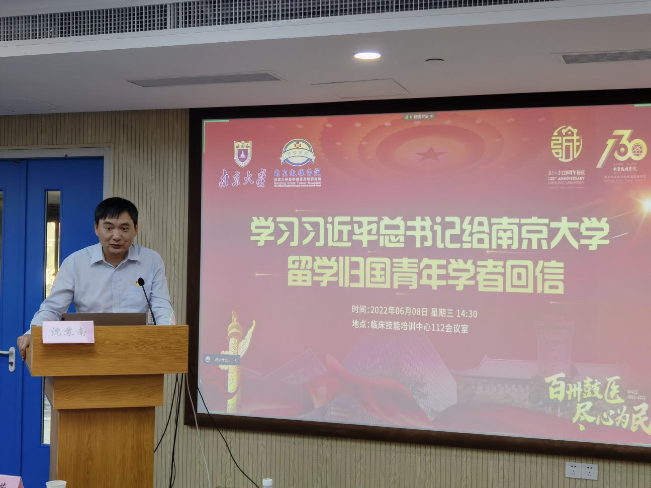 5月18日,习总书记给南京大学留学归国青年学者的回信,在全国引发强烈反响,深深激励着广大青年教师和科研工作者,鼓舞着南京大学莘莘学子们。6月8日下午,南京大学医学院附属鼓楼医院在临床技能培训中心112会议室召开“深入学习贯彻习近平总书记给南京大学留学归国青年学者重要回信精神”专题会议。南京大学医学院党委书记沈苏南,附属鼓楼医院院党委委员、纪委书记岳飚出席会议,附属鼓楼医院中青年教师代表、南京大学医学院学生代表参加座谈。会议由附属鼓楼医院教育处副处长赵晓智主持。