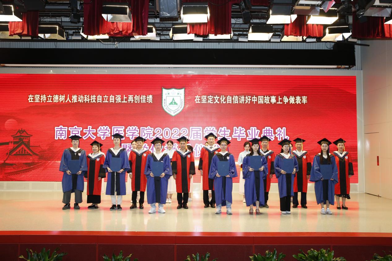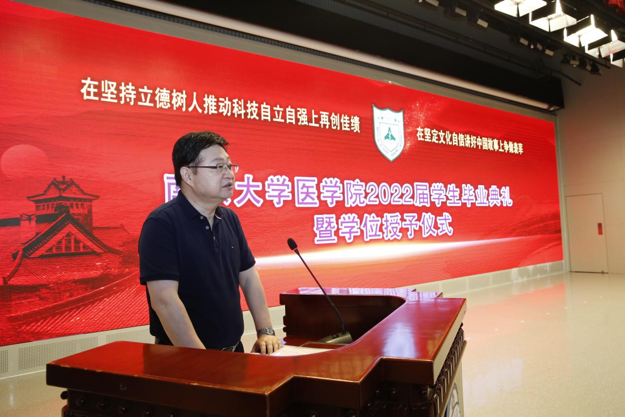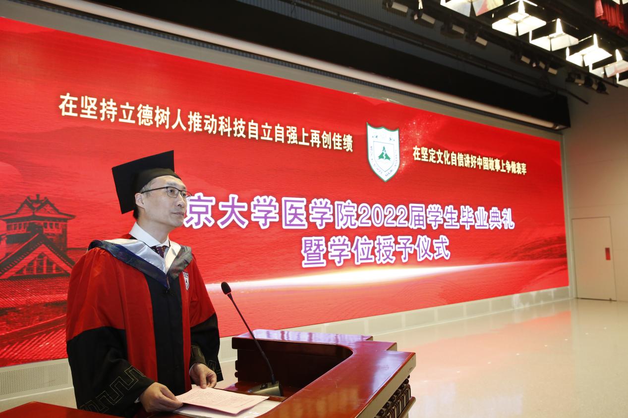 南京大学党委常委、副校长、医学院院长张峻峰在致辞中表示,今年是特殊的一年,习近平总书记殷切的回信,盛大隆重的百廿校庆和同心抗疫的伟大胜利都值得每个南大人铭记。南大的毕业生当心系国家事,肩扛国家责,把“宽德养士,至乐成学,吾道在国,与世恒新”的南大精神作为一生的信念和追求,在实现民族伟大复兴、人类文明进步的历史进程中书写绚丽的人生华章。张校长寄予2022届毕业生们“四点期望”:第一,期望同学们弘扬“吾道在国”的精神,报效国家、服务人民,做敢于担当、勇挑重任的建设者;第二,期望同学们秉承“宽德养士”的精神,敬佑生命、厚德仁爱,做大医精诚、大爱无疆的奉献者;第三,期望同学们传承“与世恒新”的精神,解放思想、勇于创新,做与时俱进、引领发展的开拓者;第四,期望同学们发扬“至乐成学”的精神,热爱学习、终生成长,做踏实进取、追求卓越的奋进者。张校长对每一位毕业生给予殷切的期盼,希望同学们都能前程似锦、未来可期!