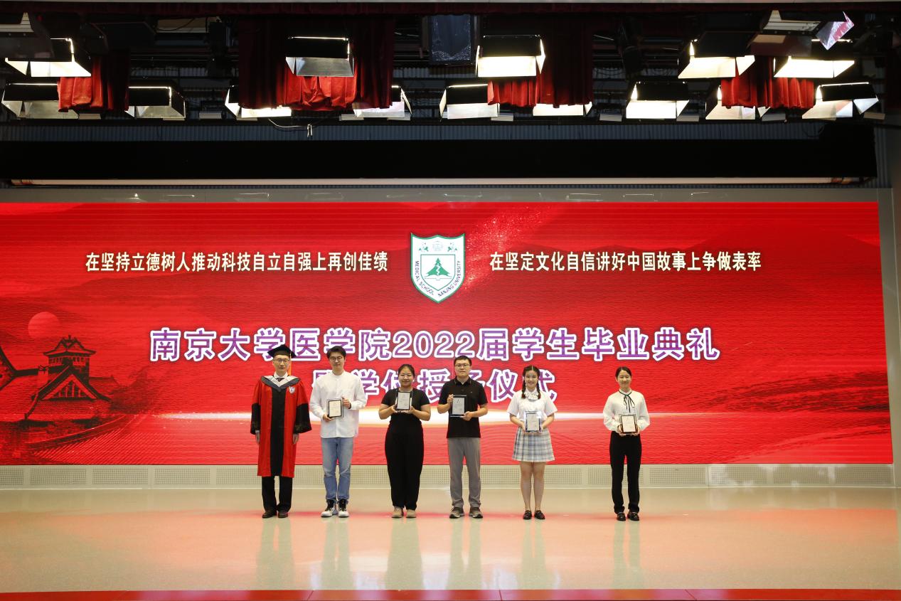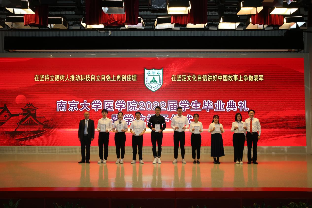 南京大学医学院副院长王宏伟宣读《南京大学医学院关于表彰优秀志愿者的决定》,附属盐城市第一人民医院党委书记查文章、南京国际医院有限公司董事会主席董沐平上台为优秀志愿者代表颁奖。南京大学医学院党委副书记王阿妮宣读《南京大学医学院关于表彰2022届优秀毕业生的决定》,附属鼓楼医院院长于成功、附属金陵医院(东部战区总医院)副院长王明华、附属口腔医院党委书记王磊为优秀毕业生代表颁发证书。张峻峰副校长为唐文悦、柴森林、纪明力、何其峰、郑畅等同学颁发校友联络人聘书。希望同学们能够继续发挥自己的影响力,积极响应学校、学院的号召,凝心聚力,贡献青春,把对祖国血浓于水、与人民同呼吸共命运的情感融汇在事业追求中,让青春之花绽放在党和人民最需要的地方。