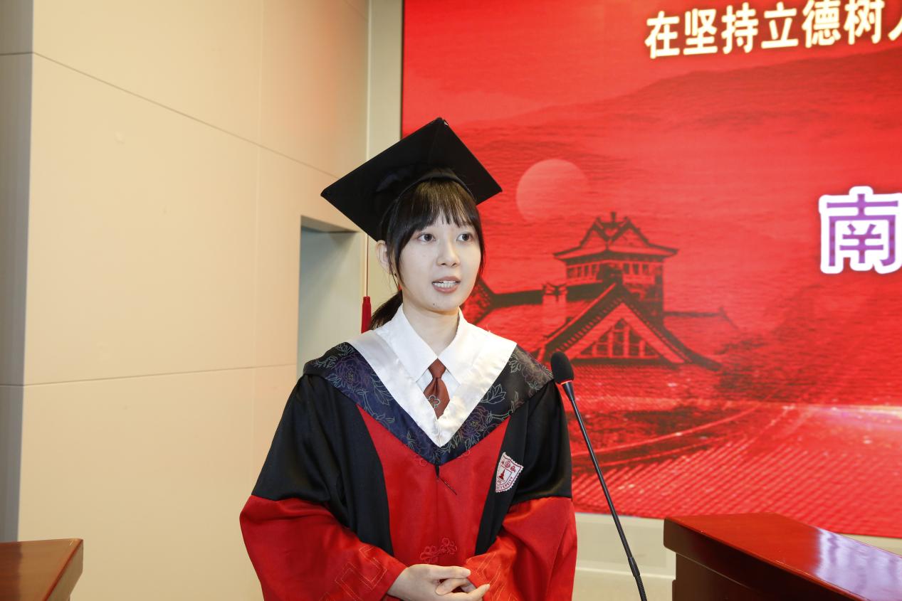 导师代表刘宝瑞教授、毕业生代表徐沁梅同学先后上台发言。刘教授回忆了自己在科研之路上经历的焦虑、茫然、惆怅和喜悦,他表示,硕士和博士的学习经历只是起点,想要达到炉火纯青的医学境界需要付出一生的时间。在将来的工作中,同学们要用科学的思维化解临床上的难题,用积极的心态面对未来的挑战,南大医学院的老师们将会给同学们提供最可靠的参谋和最有力的支持。徐沁梅同学分享了自己在国外交流访学、在国内支援疫情的经历,代表全体毕业生表达了对母校的感激和祝愿。