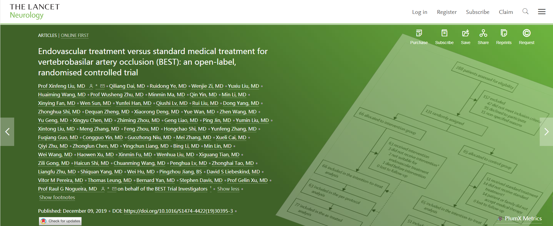 日前,由南京大学医学院附属金陵医院(东部战区总医院)神经内科刘新峰教授牵头的一项国际大型多中心随机对照临床试验——急性椎基底动脉闭塞性卒中血管再通研究(BEST研究),该研究为椎基底动脉闭塞所致后循环卒中血管内治疗提出了新的思路,研究成果于2019年12月9日在国际顶级杂志子刊-柳叶刀神经病学(The Lancet Neurology, 影响因子28.755) 在线发表。BEST研究是中国第一项发表于国际顶级杂志子刊,关于血管内治疗急性大血管闭塞卒中的临床试验。该研究填补了椎基底动脉取栓试验的国际空白,相关结果提示血管内治疗可能优于单纯药物治疗。