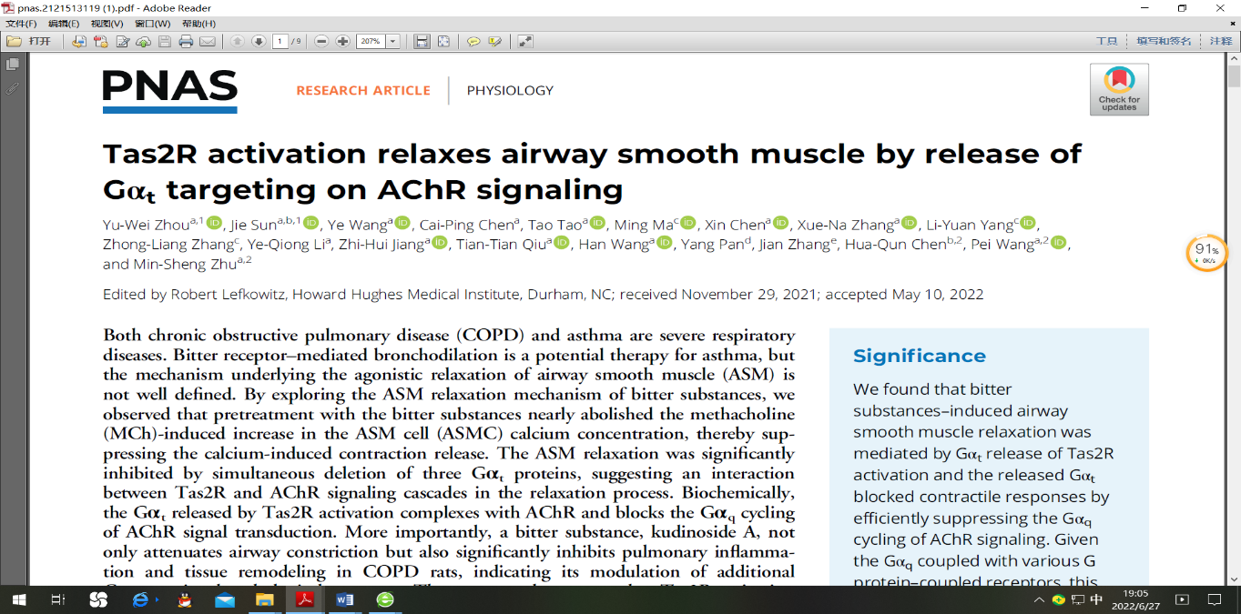 上述研究成果“Tas2R Activation Relaxes Airway Smooth Muscle by Release of Gαt Targeting on AChR Signaling”已于2022年6月23日发表在美国科学院院报《PNAS》杂志上。论文的通讯作者为南京大学医学院朱敏生教授、王佩博士和南京师范大学陈华群教授,第一作者为南京大学医学院周雨薇博士、孙婕博士,上海凯屹医药公司、云南大学的科研人员也参与了该项研究。
