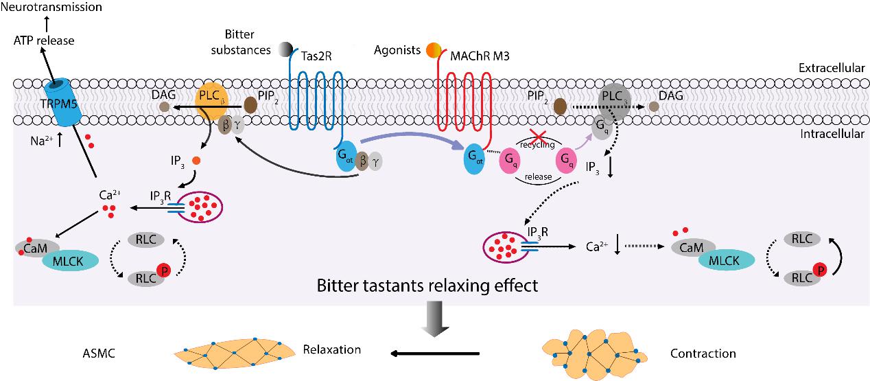 自然界中存在大量苦味物质,人类口腔中表达了二十多种不同的苦受体(Tas2R)用来感知这类物质。有意思的是,呼吸道也能表达苦受体,当苦物质作用于该受体时可导致气道舒张,有可能用于哮喘及慢性阻塞性肺病(COPD)的治疗,但苦受体松弛气道平滑肌的机制及其下游信号一直不清楚。南京大学医学院朱敏生教授课题组联合南京师范大学、上海凯屹医药科技公司等单位,通过多年探索终于揭示了苦物质松弛气道的机制。研究发现:苦物质激活Tas2R后,其偶联G蛋白Gαt 从Tas2R-Gαt/Gβγ 复合体中解离,释放出的Gαt与乙酰胆碱受体(AChR)结合,竞争性抑制AChR的偶联G蛋白Gq 的功能,阻止AChR信号诱导的钙信号,并引起平滑肌松弛。该发现不但首次完善地阐明了苦受体松弛气道平滑肌的机制,还引伸出更有意义的发现,即:因Gq与多种GPCR偶联,Gαt 对 Gq 的阻断可同时作用于多条信号通路,表现为多靶点效应。