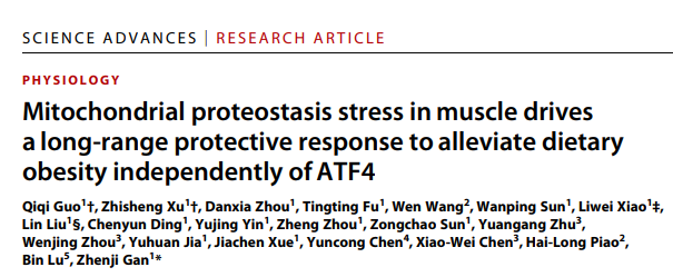 2022年7月27日,南京大学医学院甘振继课题组在Science Advances上在线发表了题为“Mitochondrial proteostasis stress in muscle drives a long-range protective response to alleviate dietary obesity independently of ATF4”的最新研究成果。这项研究定义了骨骼肌线粒体UPRmt,揭示了UPRmt在哺乳动物体内的新生理功能和作用机制,阐明了骨骼肌线粒体UPRmt 通过ATF4非依赖的机制长距离调节肝脏和脂肪代谢决定整体代谢健康。南京大学医学院博士研究生郭奇奇和徐志圣为本文的共同第一作者,甘振继教授为该篇论文的通讯作者。该研究得到了国家自然科学基金委、科技部、教育部、江苏省科技厅以及中央高校等基金的支持,同时也得到合作实验室的大力协助与支持。