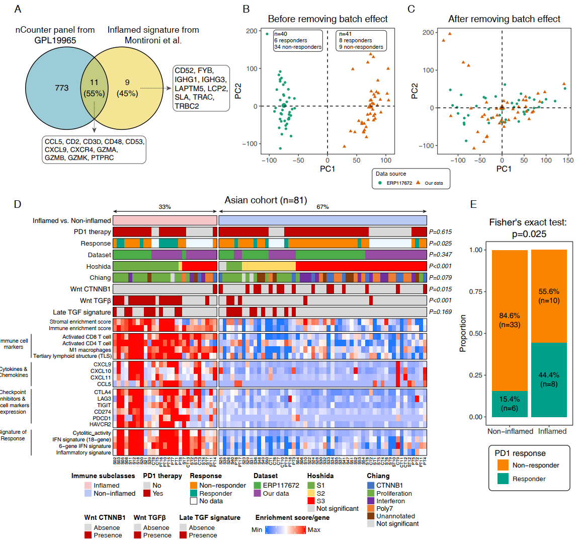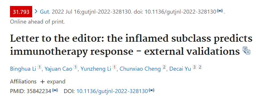 近日,南京大学医学院附属鼓楼医院余德才教授团队通过转录组测序(n=41),在亚洲肝癌人群中验证了Inflamed class可以预测肝癌患者PD1抑制剂治疗的疗效,并进一步证实该结论可以推广到泛肿瘤。该研究结果以研究性letter的形式发表于同刊,南京大学医学院附属鼓楼医院博士后黎兵华为第一作者,余德才教授为通讯作者。该工作得到了国家自然科学基金青年和面上项目的资助。