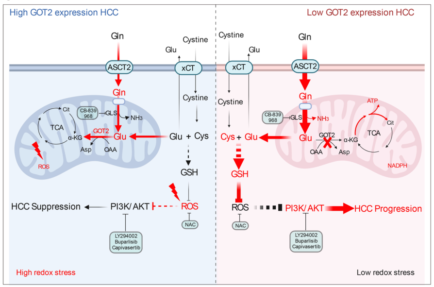 谷氨酸草酰乙酸转氨酶2(GOT2)参与谷氨酰胺代谢,介导谷氨酸和草酰乙酸转化为α-酮戊二酸和天冬氨酸。GOT2在正常肝脏组织中特异性高表达,但是随着HCC的恶性进展,GOT2的表达逐渐下调。南京大学医学院附属鼓楼医院余德才教授课题组在多个公共数据库及临床样本中明确,GOT2在HCC肿瘤组织中下调,并且与患者不良预后相关。体内外实验证实,GOT2 knockdown 促进了HCC细胞的增殖迁移、肝内及血行转移。通过13C5,15N2-谷氨酰胺同位素代谢流等实验发现,HCC中GOT2的降低,介导了谷氨酰胺代谢重编程,转向合成还原性谷胱甘肽(GSH),通过抵抗HCC进展中活性氧(ROS)损伤,维持肿瘤细胞氧化还原稳态,激活PI3K/AKT/mTOR信号通路从而促进了HCC的恶性进展。与此同时,GOT2沉默增强了HCC谷氨酰胺依赖及谷氨酰胺酶抑制剂(CB-839)的敏感性,通过体内外实验及LIMOR数据库证实GOT2沉默促进了HCC的CB-839治疗反应性。因此,GOT2有望成为HCC诊断和治疗的新靶点。