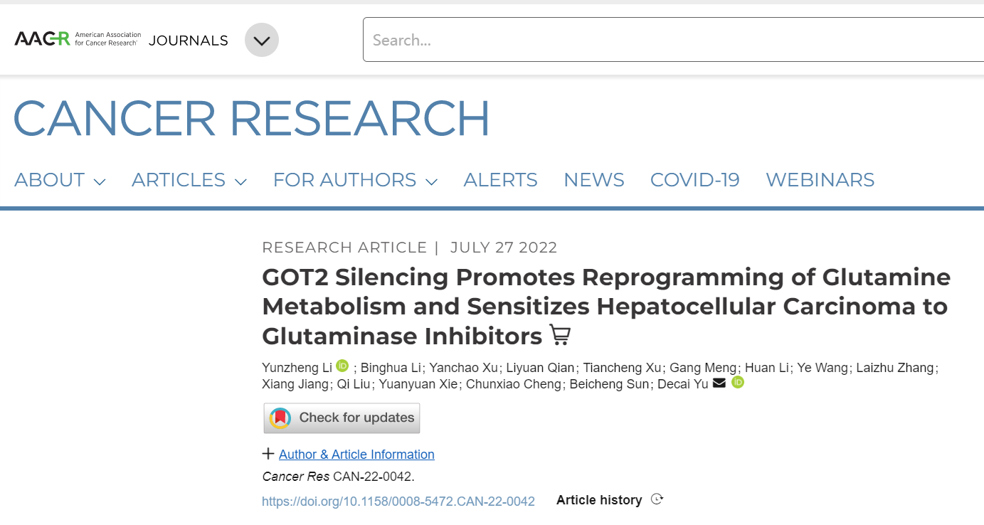 2022年7月27日,南京大学医学院附属鼓楼医院余德才教授团队,在著名期刊Cancer Research上在线发表最新研究成果“GOT2 silencing promotes reprogramming of glutamine metabolism and sensitizes hepatocellular carcinoma to glutaminase inhibitors”。 这是该团队在肝脏肿瘤代谢方向上的又一独立性研究成果。南京大学医学院附属鼓楼医院余德才教授为通讯作者,南京大学医学院附属鼓楼医院李运政博士、黎兵华博士为该论文的共同第一作者。