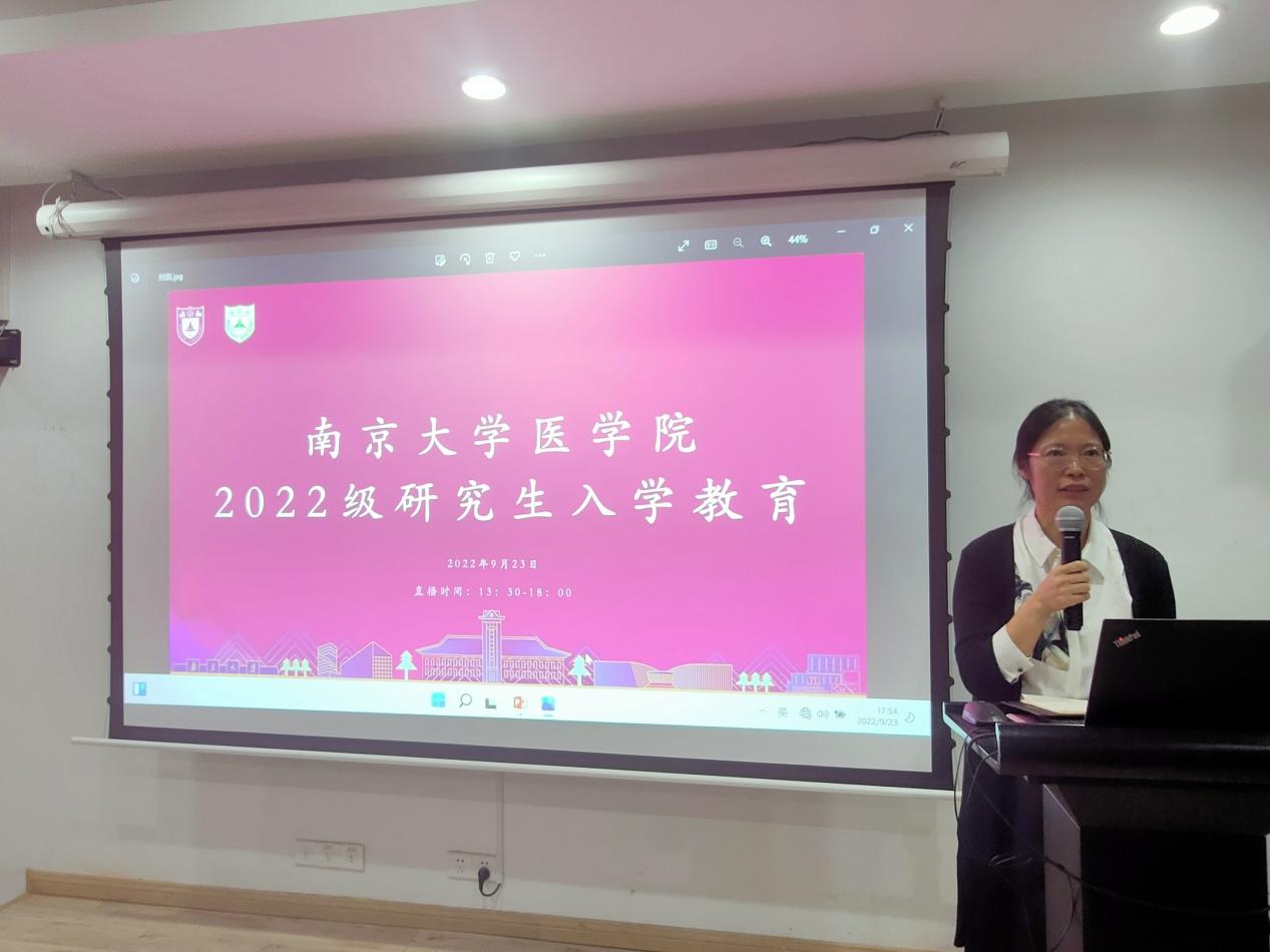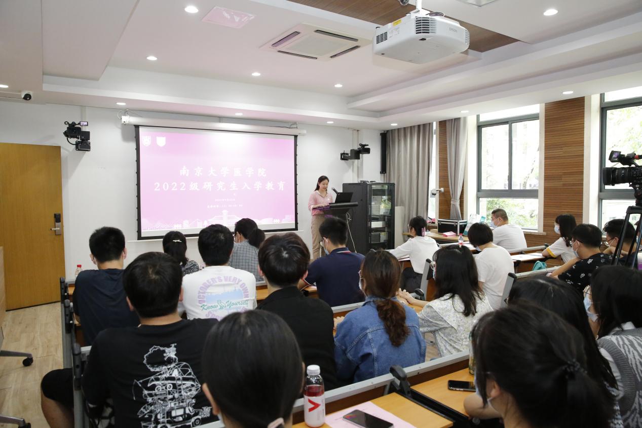恰逢南京大学建校120周年,总书记寄语南大青年心系“国家事”、肩扛“国家责”。为深入学习总书记回信精神,适应党和国家事业发展需要,助力同学们更好适应研究生阶段学习、生活,2022年9月23日南京大学医学院在鼓楼校区东南楼成功举办2022级研究生入学教育活动。本次活动以“心系国家事、肩扛国家责”为主题,医学院党委副书记王阿妮老师以及医学院、附属医院的各位专家学者出席本次活动,全体研究生新生线上线下同步观看。