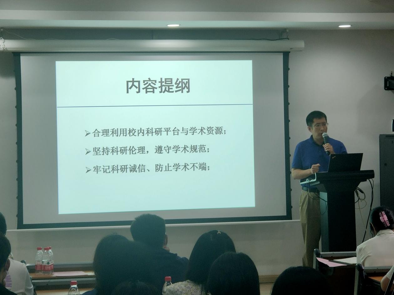 王宏伟副院长和院办应锋主任分别为同学们介绍了科研体系、实验平台、科研规范以及实验室安全相关内容。王宏伟副院长希望同学们要合理利用校内科研平台与学术资源;坚持科研伦理,遵守学术规范;牢记科研诚信、防止学术不端,做诚实守信的南大学子。应锋主任向同学们讲述了高校实验室安全的重要性。“学途有规,安全先行”,应锋主任提醒同学们在日常实验室使用过程中,要注意个人防护、排除安全隐患、养成良好的实验习惯。