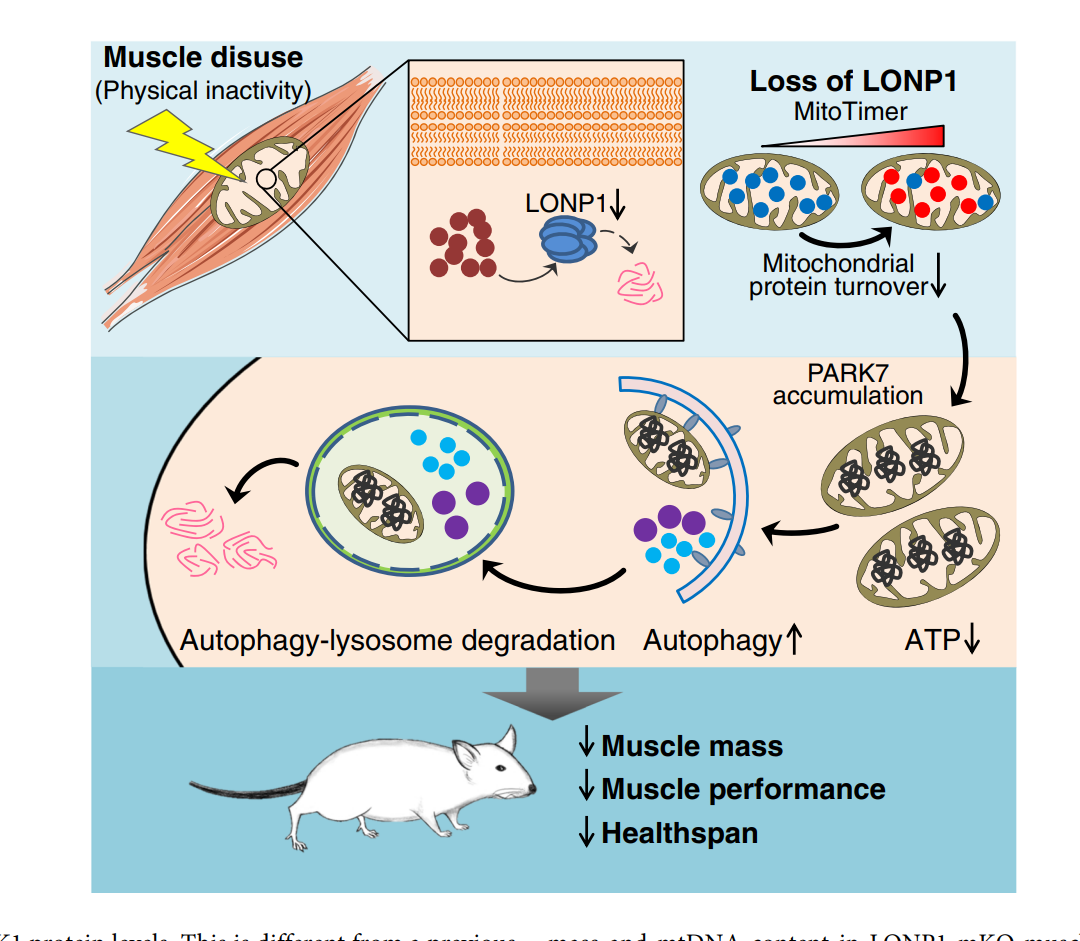 Skeletal muscle, a metabolically demanding tissue, critically depends on mitochondrial functions. However, the regulation of muscle mitochondrial quality and its physiological impacts remain largely unknown. This study has discovered a novel muscle disuse sensing mechanism that links mitochondrial protein quality to muscle mass maintenance (Figure 1). It was found that muscle mitochondrial LONP1 protease acts as a physical activity sensor that is downregulated in disused muscles in mice and humans. Strong data were provided using two mouse models lacking LONP1 in skeletal muscle and primary skeletal myotubes in culture, which demonstrates that LONP1 is essential for safeguarding mitochondrial quality and preserving skeletal muscle mass and strength. The study also uncovered novel molecular mechanisms, such as the aberrant accumulation of mitochondrial-retained protein in muscle upon loss of LONP1, which induces the activation of autophagy-lysosome degradation program of muscle loss. Moreover, the study established that overexpression of mitochondrial-retained LONP1 target protein in skeletal muscle is sufficient to activate autophagy and cause muscle loss and weakness. This LONP1 mechanism likely represents an unrecognized mitochondrial sensor of cellular stress under a diverse array of physiological and pathophysiological circumstances.