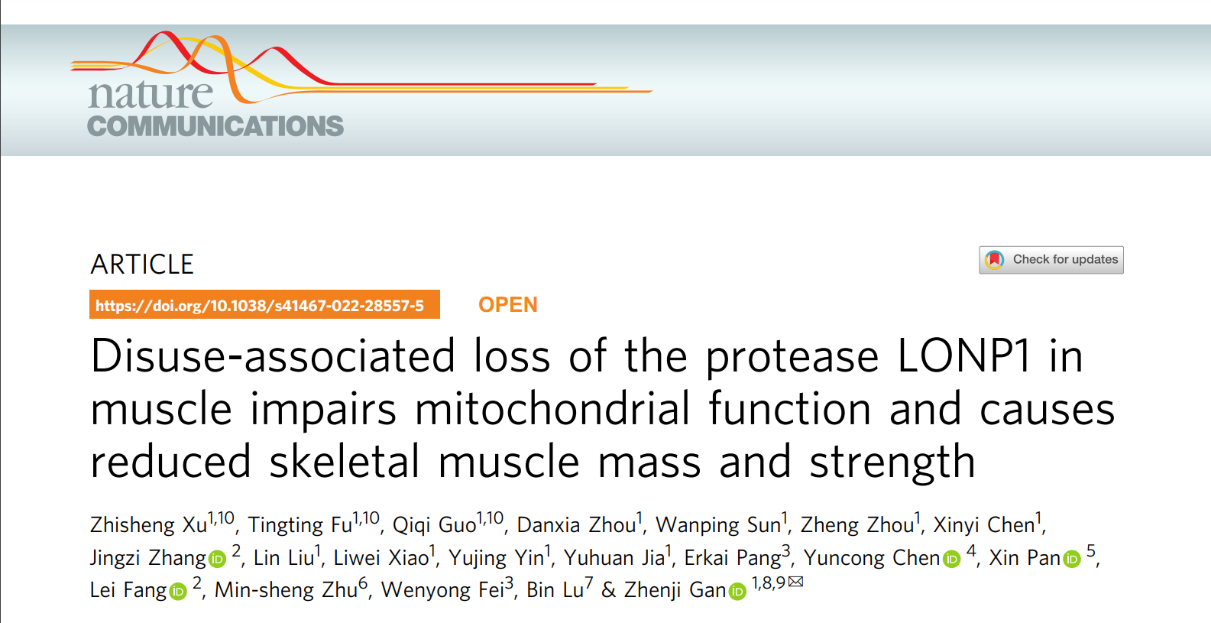 On February 16, 2022, Nature Communications published the latest research findings from Professor Zhenji Gan’s group titled “Disuse-associated loss of the protease LONP1 in muscle impairs mitochondrial function and causes reduced skeletal muscle mass and strength.” The co-first authors of this paper are Zhisheng Xu, Tingting Fu, and Qiqi Guo, who are doctoral students from Nanjing University, with Professor Zhenji Gan as the corresponding author. This research has revealed the mechanism behind the relationship between the regulation of mitochondrial protein homeostasis and the maintenance of skeletal muscle mass and function during the process of muscle disuse.